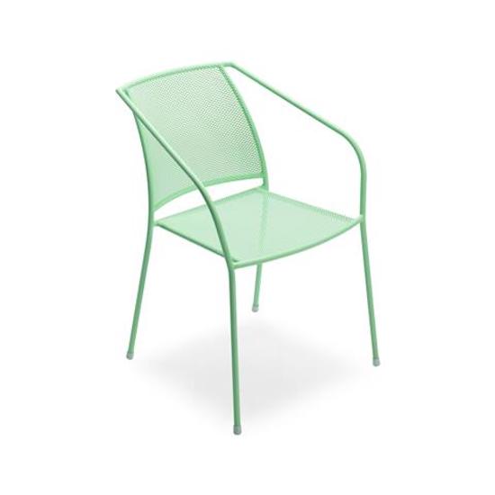 Stuhl aus perforiertem Eisen, pulverbeschichtet in grüner Wasserfarbe, mit Armlehnen, stapelbarGröße cm 665 x 55 x 72, Beinteil d. 16 mm x 1.