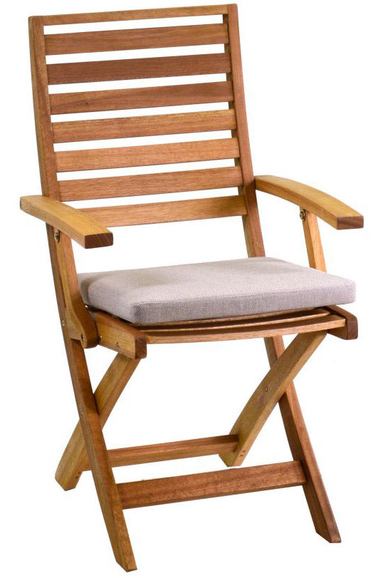 Klappstuhl aus Eukalyptusholz mit Armlehnen und Kissen.