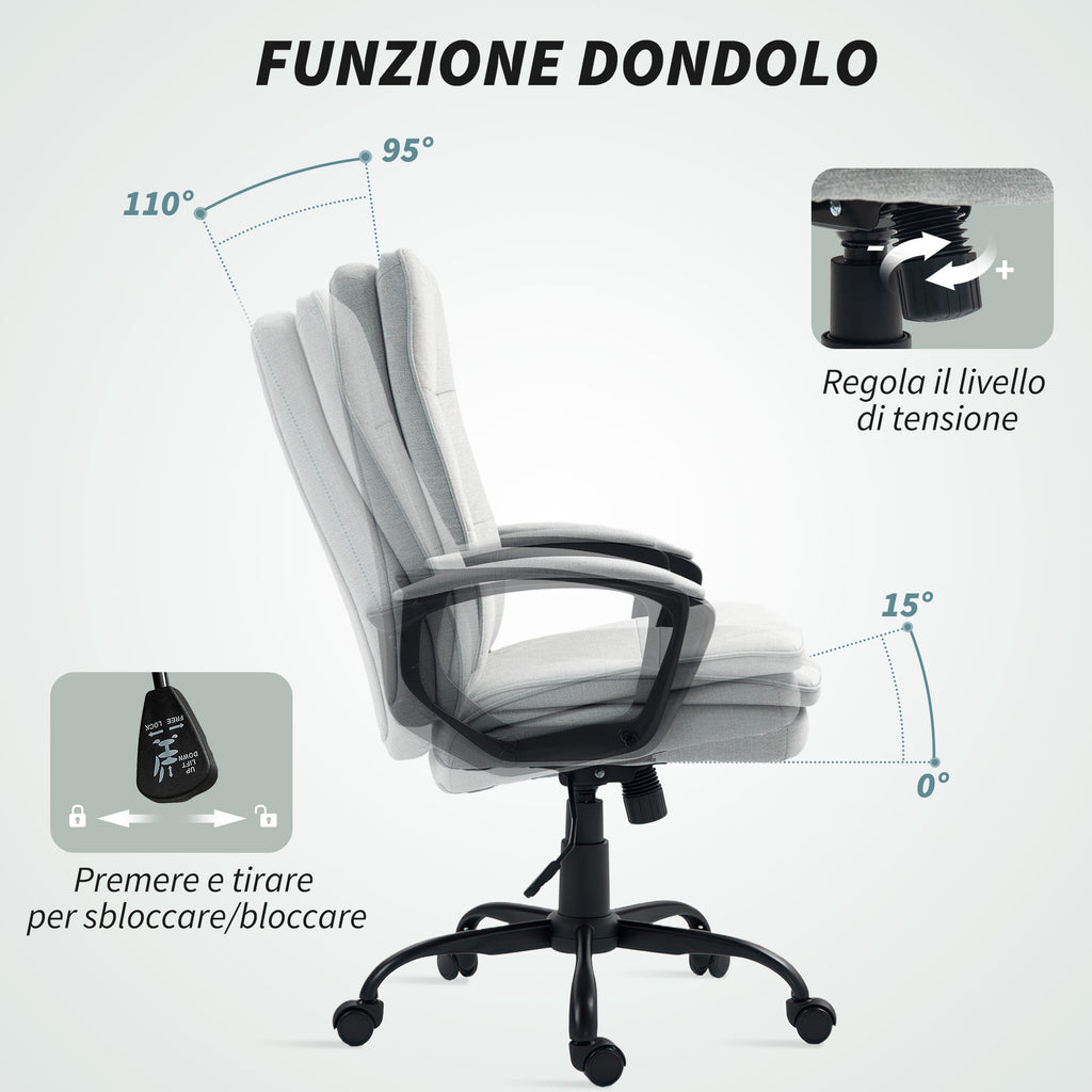Scopri il comfort della sedia da ufficio, realizzata con un doppio cuscinetto in schiuma ad alta densità e rivestita in tessuto traspirante effetto lino. Dondolati sulla sedia per scrivania ogni volta che fai una pausa, e regola l'altezza del sedile grazie al pistone a gas integrato, per mantenere la giusta postura durante le ore di lavoro. Un tocco di stile per il tuo spazio lavorativo! Doppio strato di imbottitura in schiuma ad alta densità garantisce un comfort ottimale durante le lunghe ore seduti. Sedia da ufficio in tessuto effetto lino traspirante che migliora la circolazione dell'aria. La funzione di inclinazione consente un dolce dondolio per un maggiore relax. Altezza della seduta regolabile con pistone a gas di classe tre facile da usare. Sedia girevole con ruote adatte per diverse superfici e che non graffiano il pavimento. Stile moderno, linee pulite con tonalità di grigio. Facile da montare.