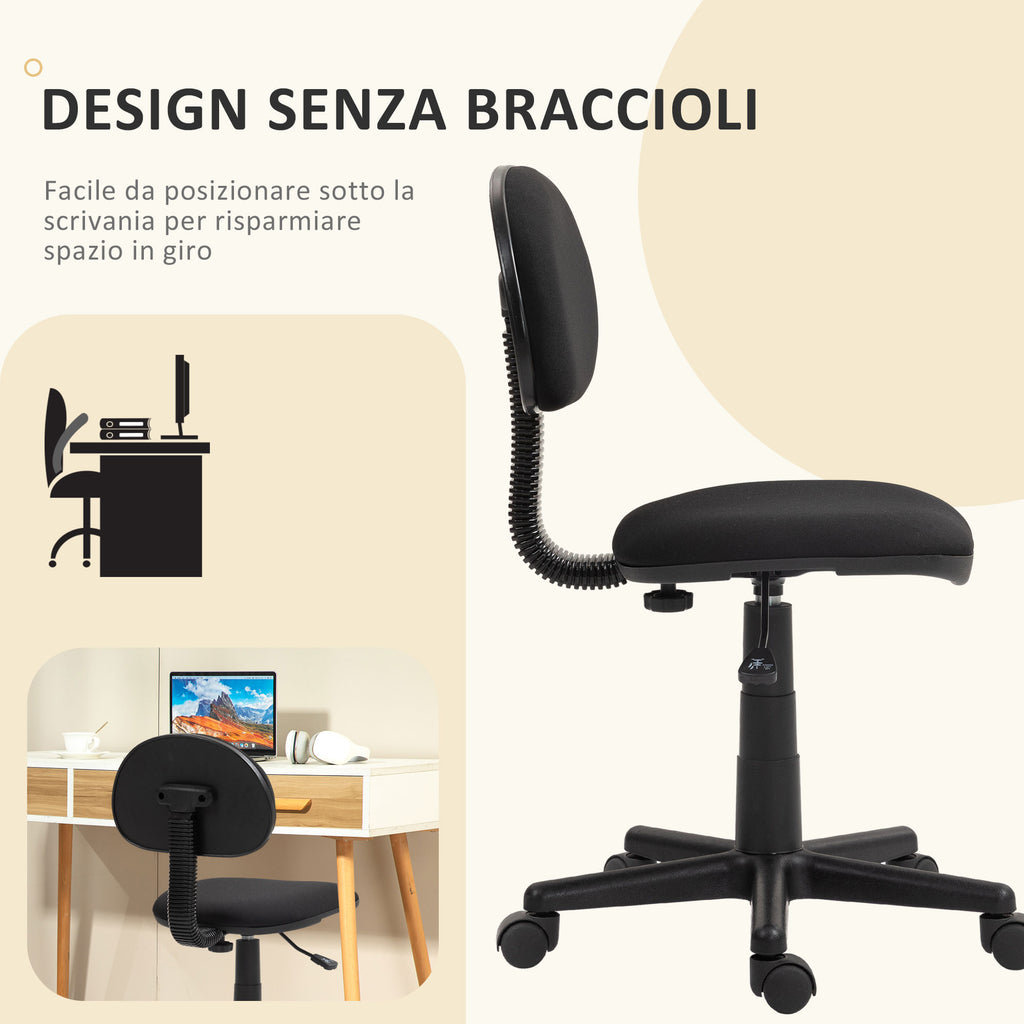 Rinnova il tuo spazio di lavoro con questa pratica sedia da ufficio! La struttura è dotata di uno schienale basso, tessuto elastico e spugna per imbottitura densa per offrirti un comfort ottimale. Il suo design senza braccioli è ideale per spazi ridotti, mentre la seduta regolabile in altezza e le ruote girevoli la faranno diventare la tua sedia preferita in pochissimo tempo!