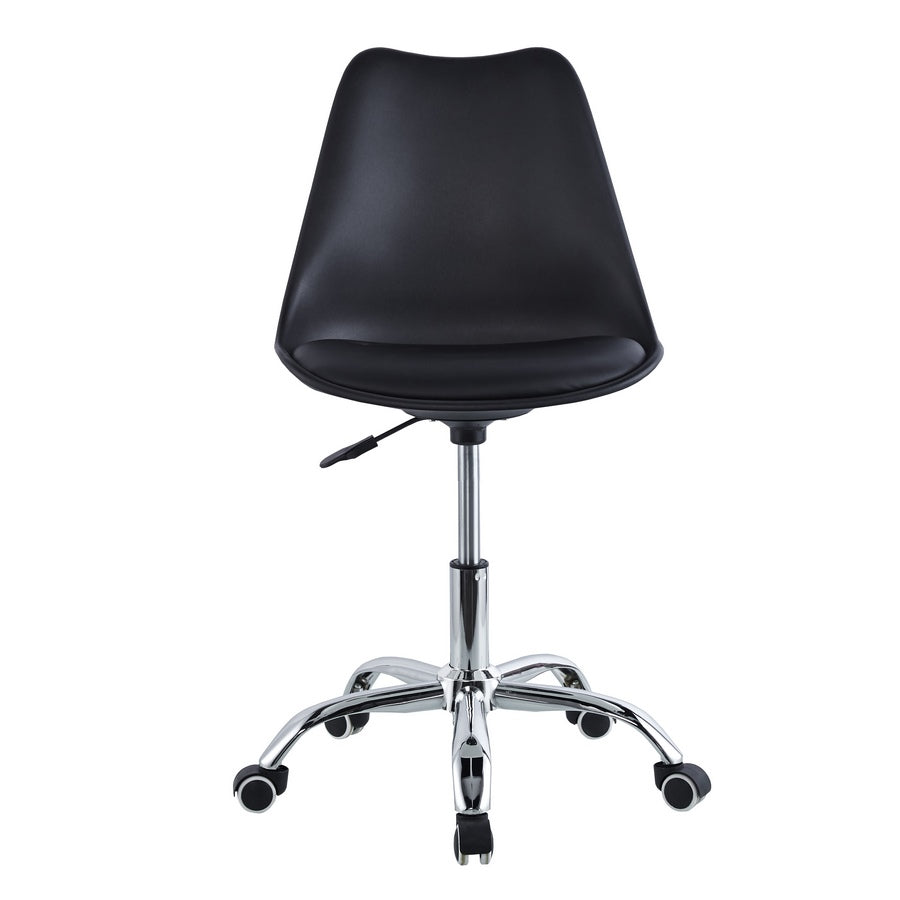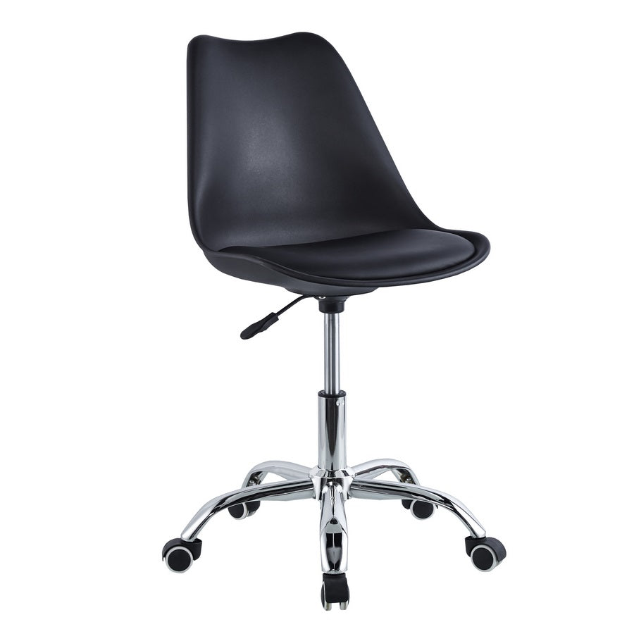 Scegli la giusta sedia ergonomica da ufficio, scegli May! Funzionale, versatile e molto ergonomica la sedia ufficio con ruote May. Una sedia ufficio dal design moderno con gambe in acciaio cromato, uno schienale e una seduta in polipropilene di colore nero con cuscino in similpelle e un'altezza regolabile tramite pistone a gas. Questa sedia da scrivania si adatta perfettamente ad un utilizzo esclusivamente interno; in ufficio o nella cameretta dei ragazzi. Ti permette di muoverti liberamente grazie alle sue 5 ruote e si adatta perfettamente con qualsiasi stile di arredamento in casa o in ufficio.