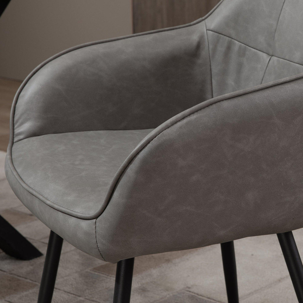 Suchen Sie einen Esszimmerstuhl, der nicht nur schick, sondern auch sehr bequem ist? Dieser Sitz wurde entwickelt, um Ihnen maximalen Komfort zu bieten: Er hat eine umhüllende Rückenlehne, eine dicke Schaumstoffpolsterung und zwei 4 cm breite Armlehnen. Die Kombination der schwarzen Metallbeine und des grauen Kunstlederbezugs verleiht ihm ein modernes Aussehen, das perfekt ist, um eine raffinierte Atmosphäre zu schaffen.