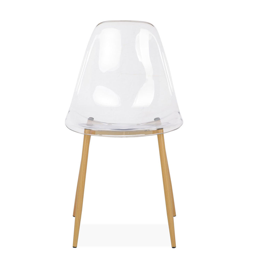 Stuhl mit Sitz aus transparentem Methacrylat und Metallbeinen in Eichenoptik.