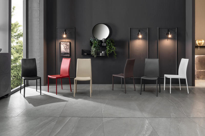 Stuhl mit Metallstruktur, vollständig mit Kunstleder bezogen.