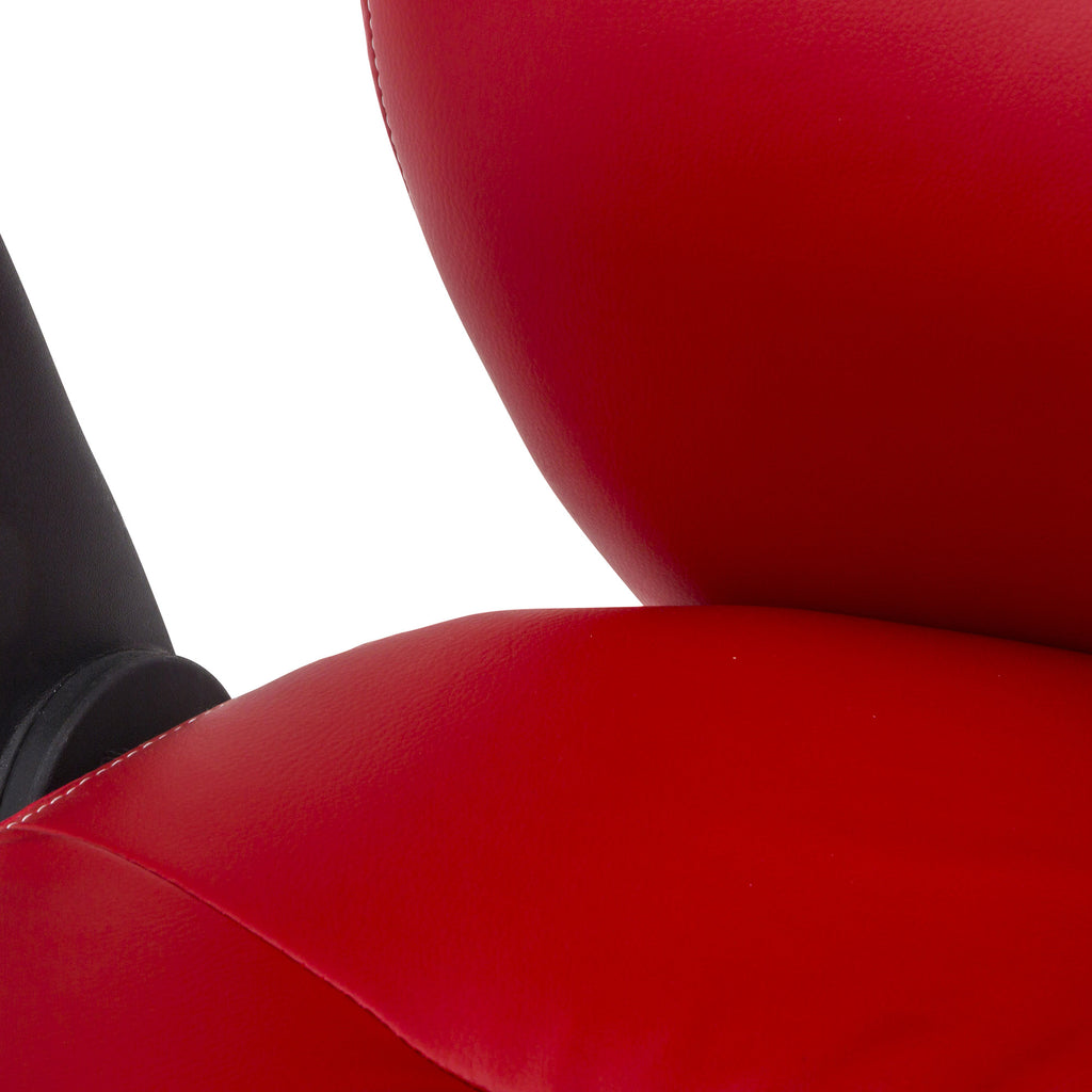 - Sitz und Rücken mit Polyurethanpolsterung und rotem Kunstlederbezug mit Kontrastnähten