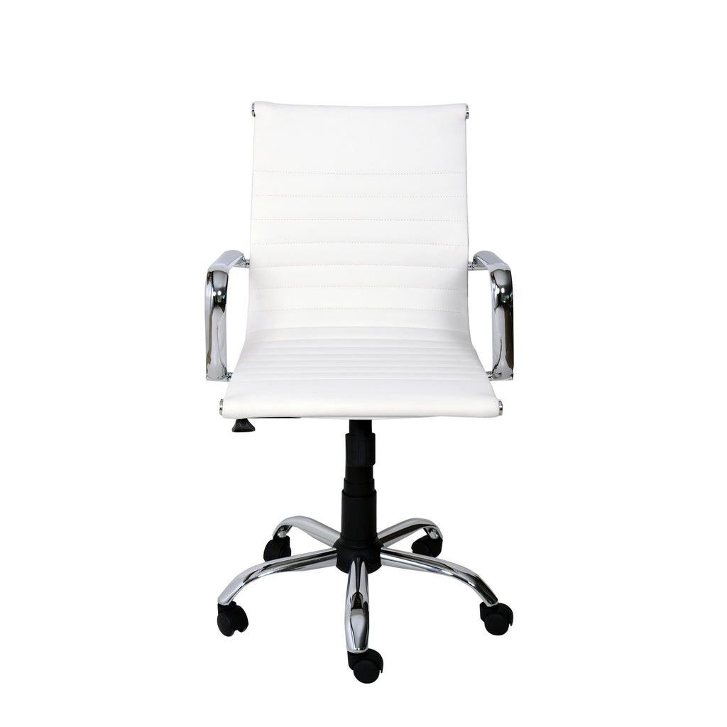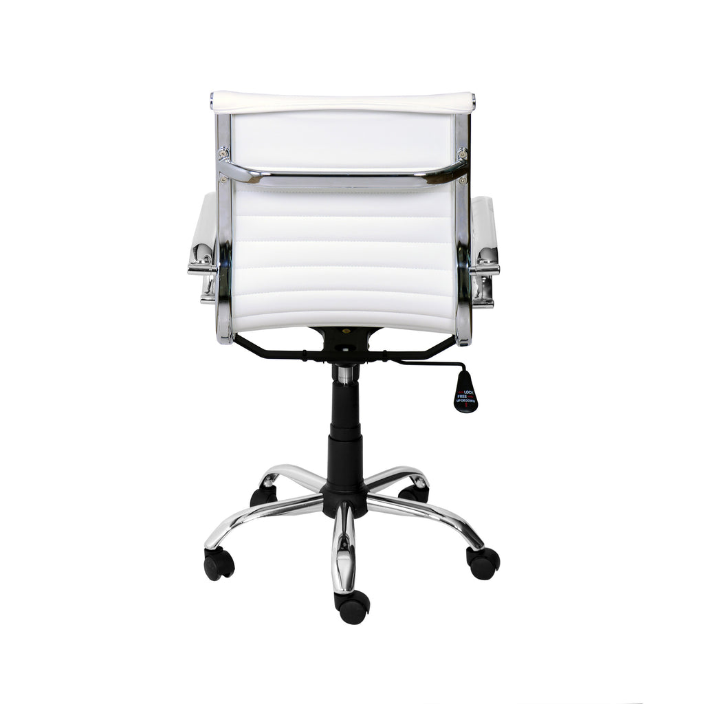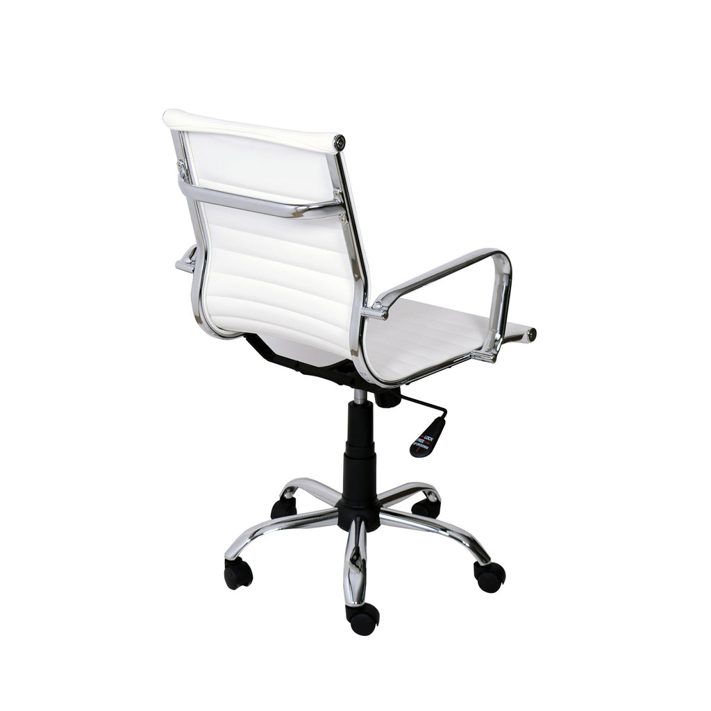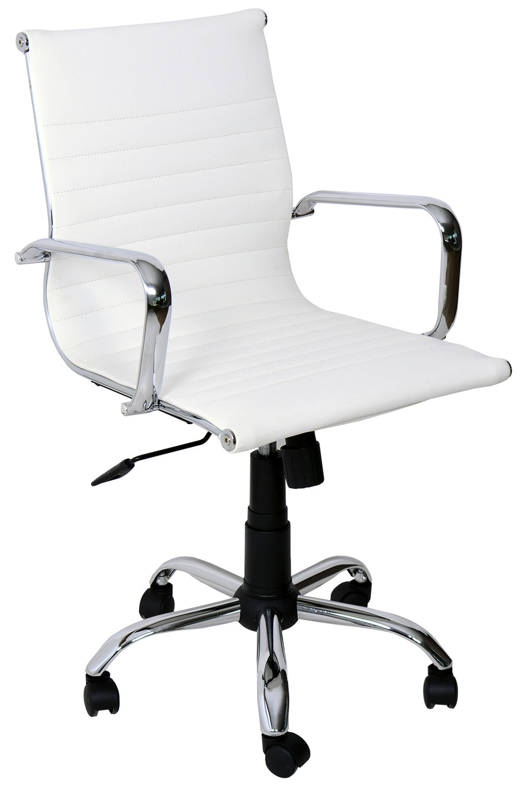 AKKA Richtungsdrehbarer Bürosessel, ausgestattet mit Gasfedermechanismus und Kippmechanismus. Eine Bewegung des Hebels nach oben wirkt sich auf die Höhe des Sitzes aus, eine Bewegung des Hebels nach außen schaltet den Sitz in den Neigungsmodus und kehrt in die feste Position zurück, indem der Hebel nach innen in die verriegelte Position zurückgebracht wird. Verchromte Metallstruktur mit Fünfsternfuß, ausgestattet mit ABS-Rädern. Der Sitz ist mit Polyurethan gepolstert und mit Kunstleder bezogen, Armlehnen aus verchromtem Metall.