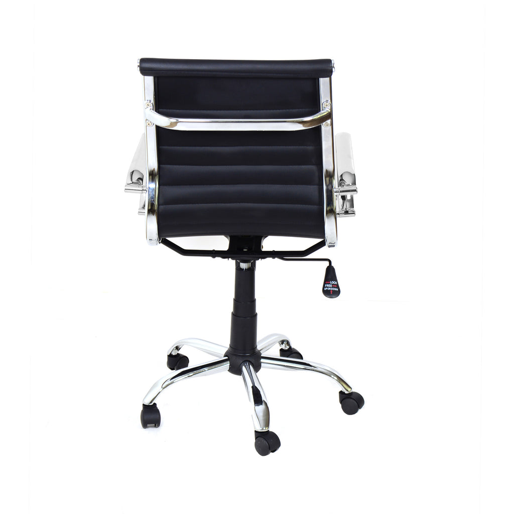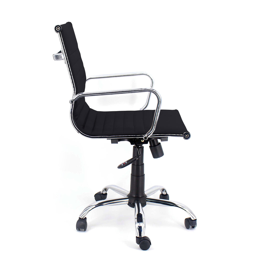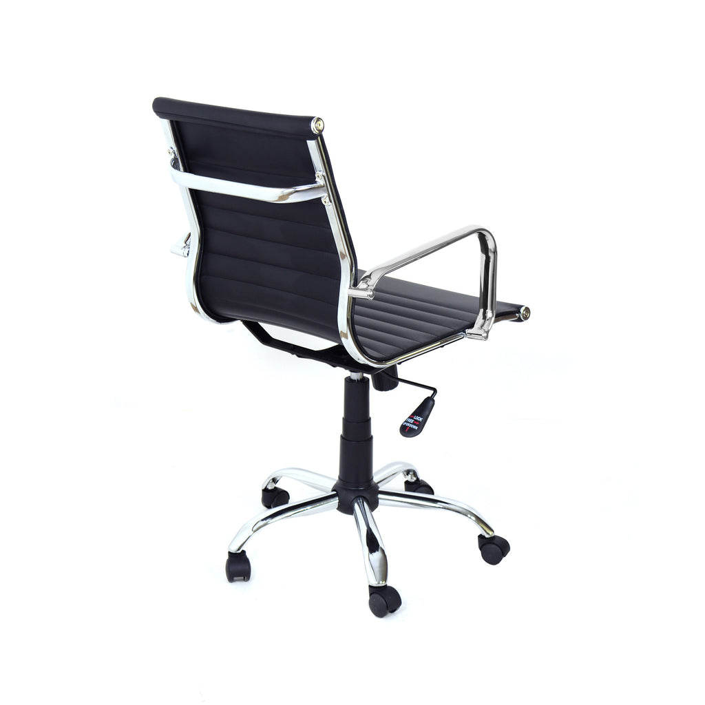AKKA Richtungsdrehbarer Bürosessel, ausgestattet mit Gasfedermechanismus und Kippmechanismus. Eine Bewegung des Hebels nach oben wirkt sich auf die Höhe des Sitzes aus, eine Bewegung des Hebels nach außen schaltet den Sitz in den Neigungsmodus und kehrt in die feste Position zurück, indem der Hebel nach innen in die verriegelte Position zurückgebracht wird. Verchromte Metallstruktur mit Fünfsternfuß, ausgestattet mit ABS-Rädern. Der Sitz ist mit Polyurethan gepolstert und mit Kunstleder bezogen, Armlehnen aus verchromtem Metall.