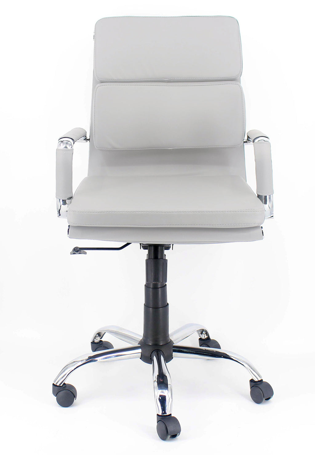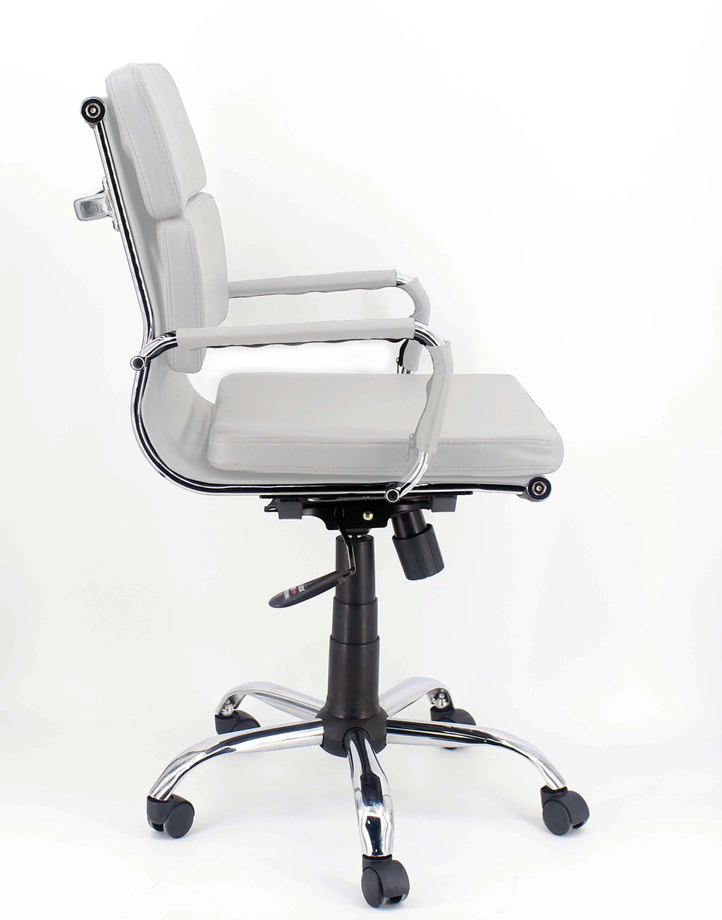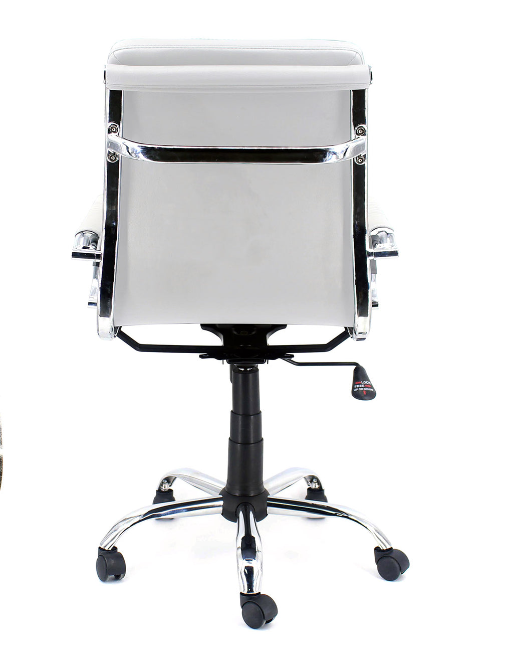Drehbarer Bürosessel, ausgestattet mit Gasfedermechanismus und Kippmechanismus. Das Bewegen des Hebels nach oben wirkt sich auf die Höhe des Sitzes aus. Wenn Sie den Hebel nach außen bewegen, wechselt der Sitz in den Neigungsmodus und kehrt in die feste Position zurück, indem Sie den Hebel nach innen in die Verriegelungsposition zurückführen. Verchromte Metallstruktur mit Fünfsternfuß, ausgestattet mit ABS-Rädern. Der Sitz ist mit Polyurethan gepolstert und mit schwarzem Kunstleder bezogen. Die Rückenlehne besteht aus drei Modulen, die mit Polyurethan gepolstert und mit weißem Kunstleder bezogen sind. Armlehnenbezüge aus weißem Kunstleder.