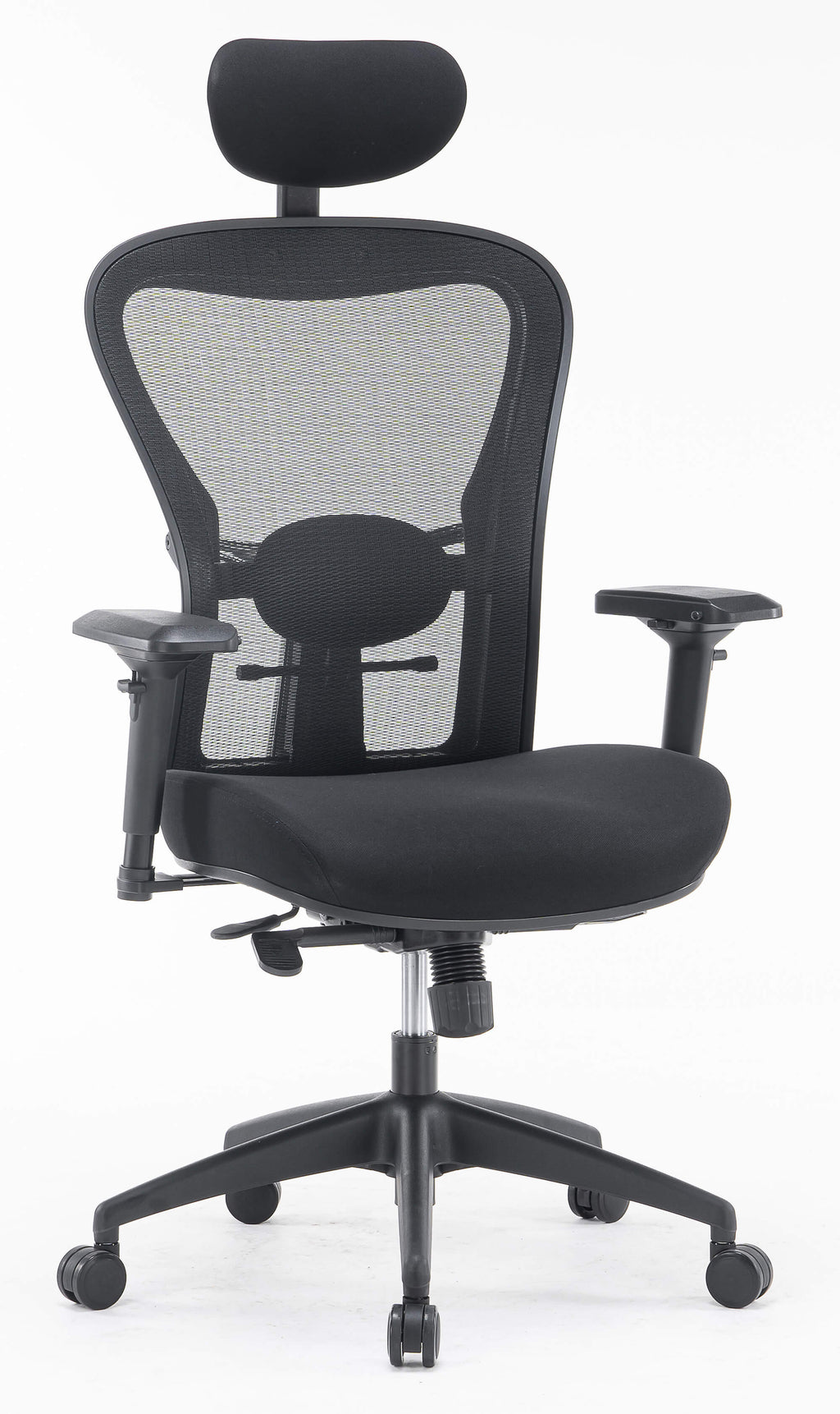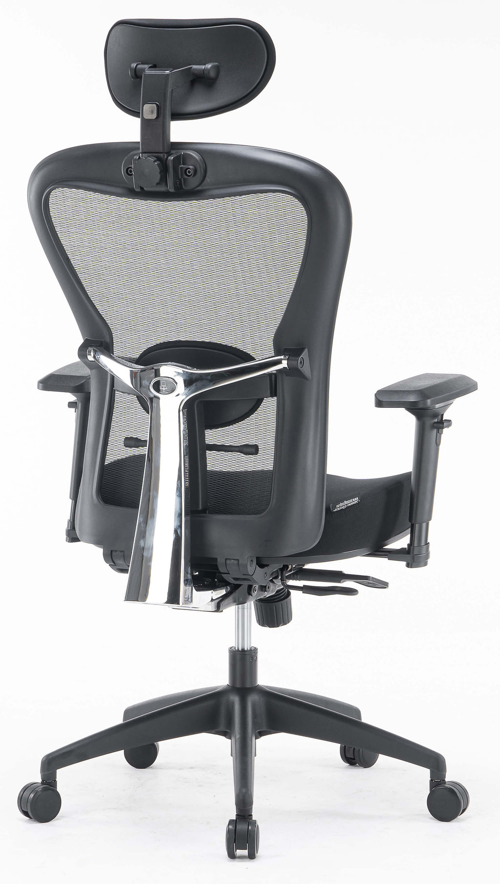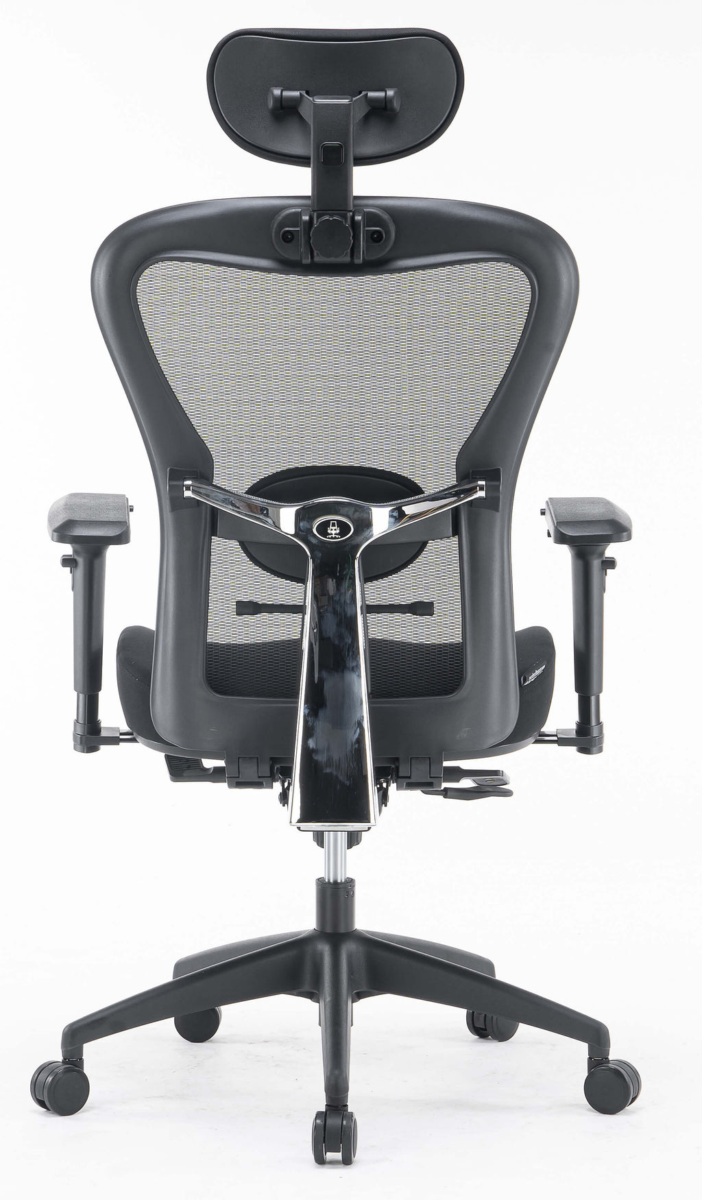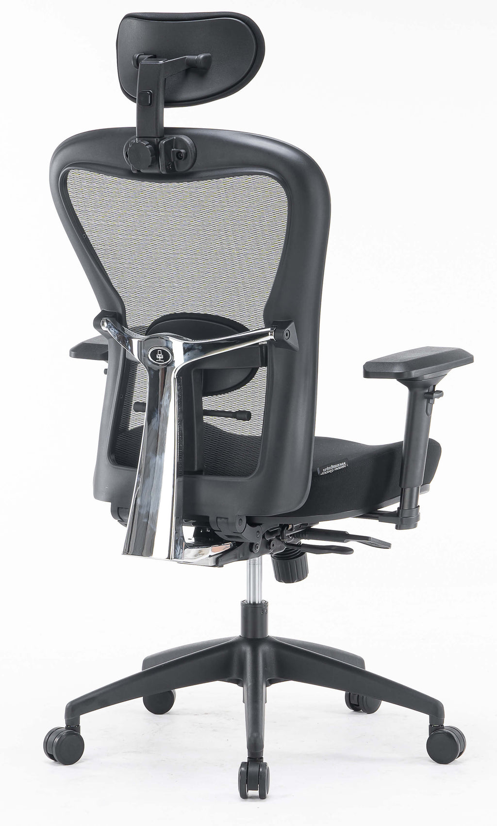 - In mehreren Positionen verstellbare Rückenlehne, bezogen mit schwarzem, atmungsaktivem technischem Mesh mit verstellbarer, schwarz gepolsterter Kopfstütze und Lordosenstütze