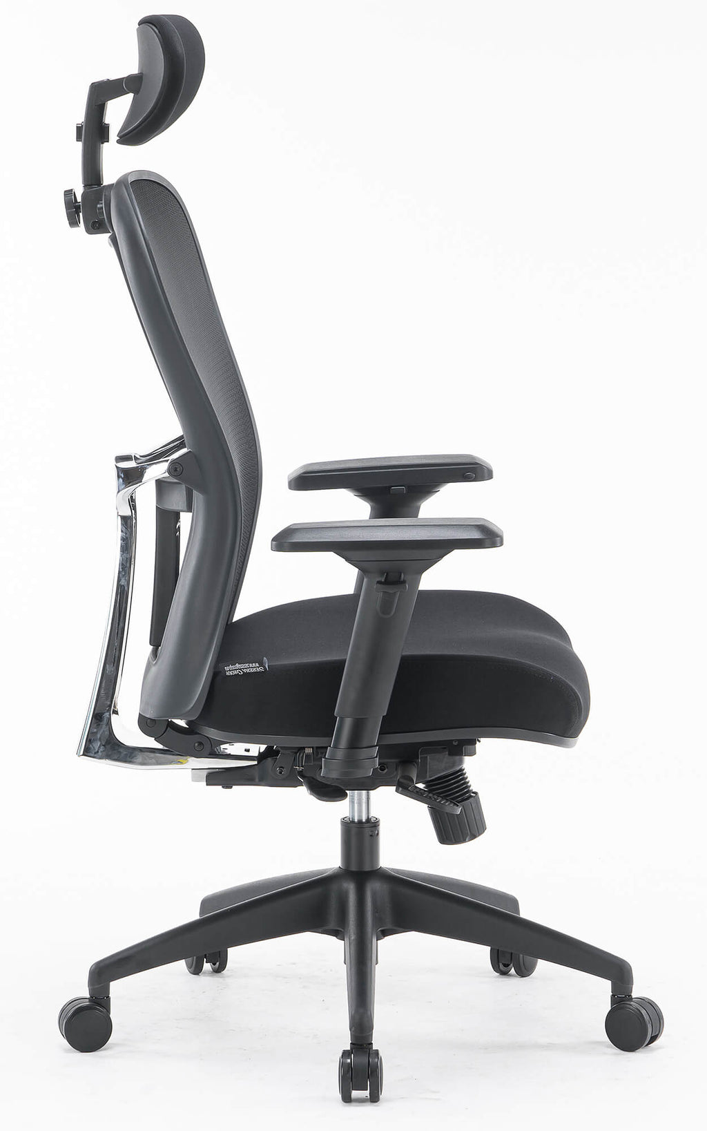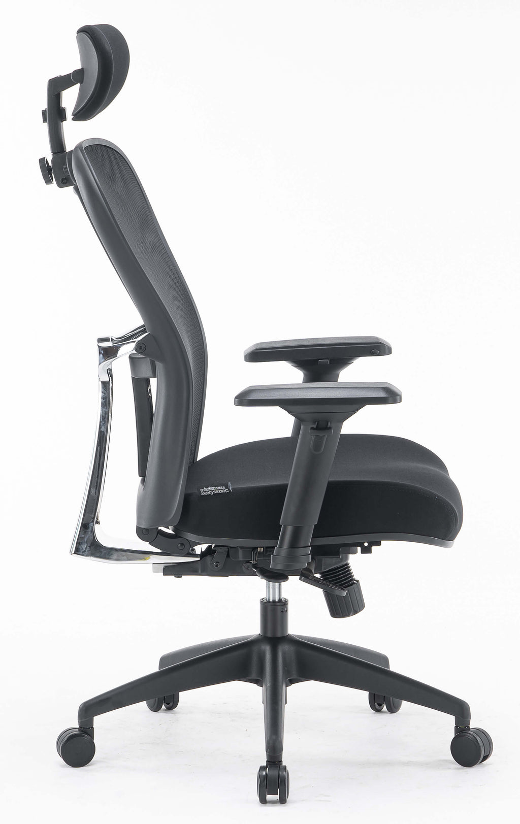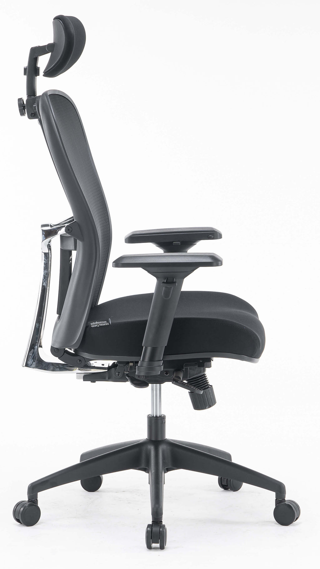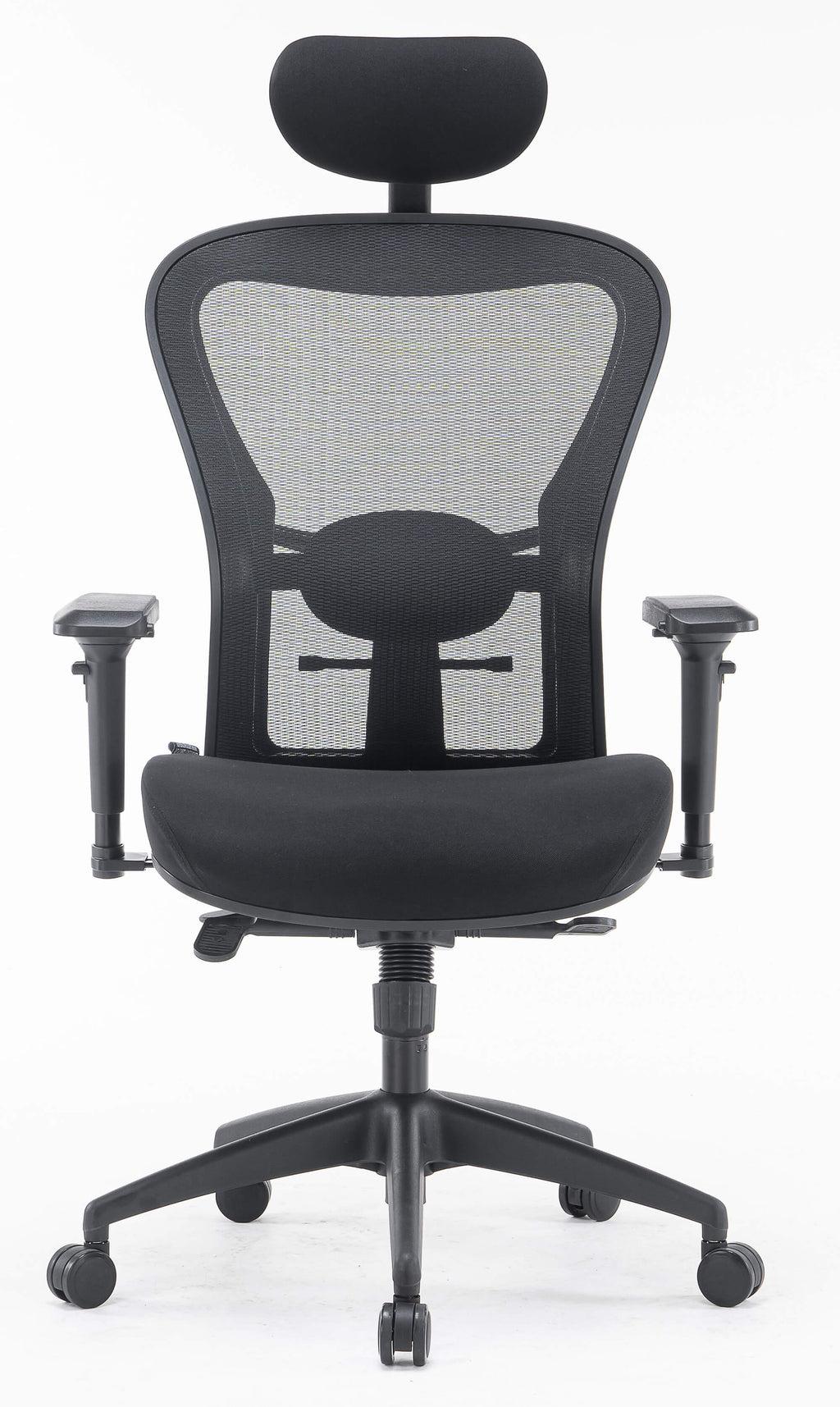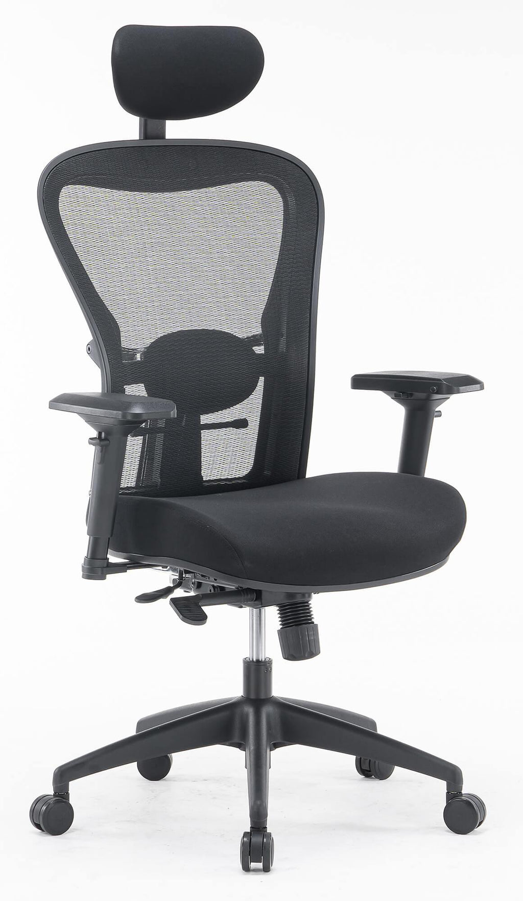 - In mehreren Positionen verstellbare Rückenlehne, bezogen mit schwarzem, atmungsaktivem technischem Mesh mit verstellbarer, schwarz gepolsterter Kopfstütze und Lordosenstütze