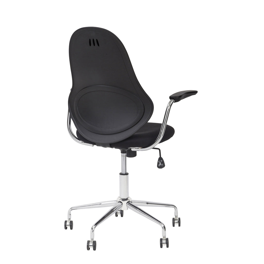 Drehsessel mit verstellbarer Rückenlehne und Gasdruckfeder, mit verchromter Metallstruktur und gepolstertem Sitz mit schwarzer Textur.