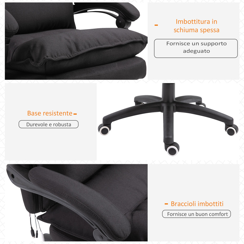 Sedia Poltrona Operativa da Ufficio Reclinabile con Poggiapiedi Estraibile e 6 Punti di Massaggio in Tessuto Effetto Lino Nero