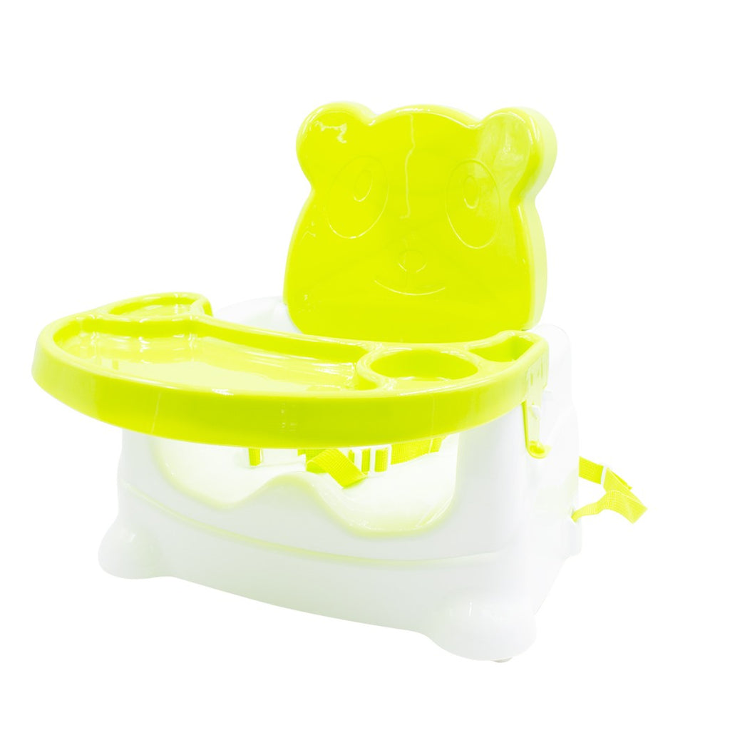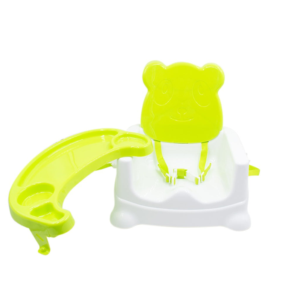 Kinderhochstuhl Tischbefestigung Sicherheitsgurt und grünes Tablett