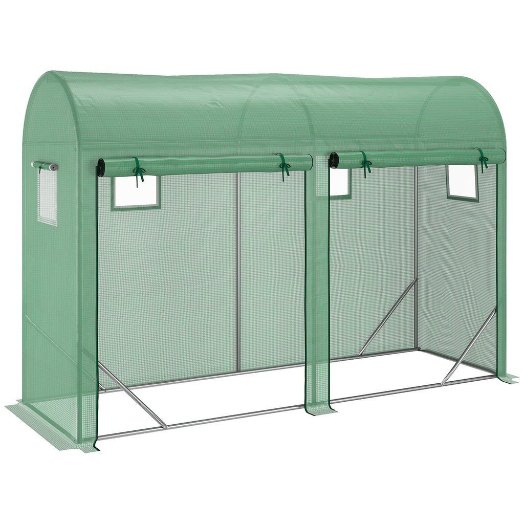 - 4 FENSTER: An den Seiten und an der Rückwand angebracht, lassen sie Sonnenlicht herein, fördern die Luftzirkulation und ermöglichen es Ihnen, Ihre Pflanzen zu überprüfen ABMESSUNGEN: Gesamtabmessungen: 300 B x 100 T x 200 Hcm. Türgröße: 130L x 145Hcm. Fenstergröße: 35 L x 35 Pcm.