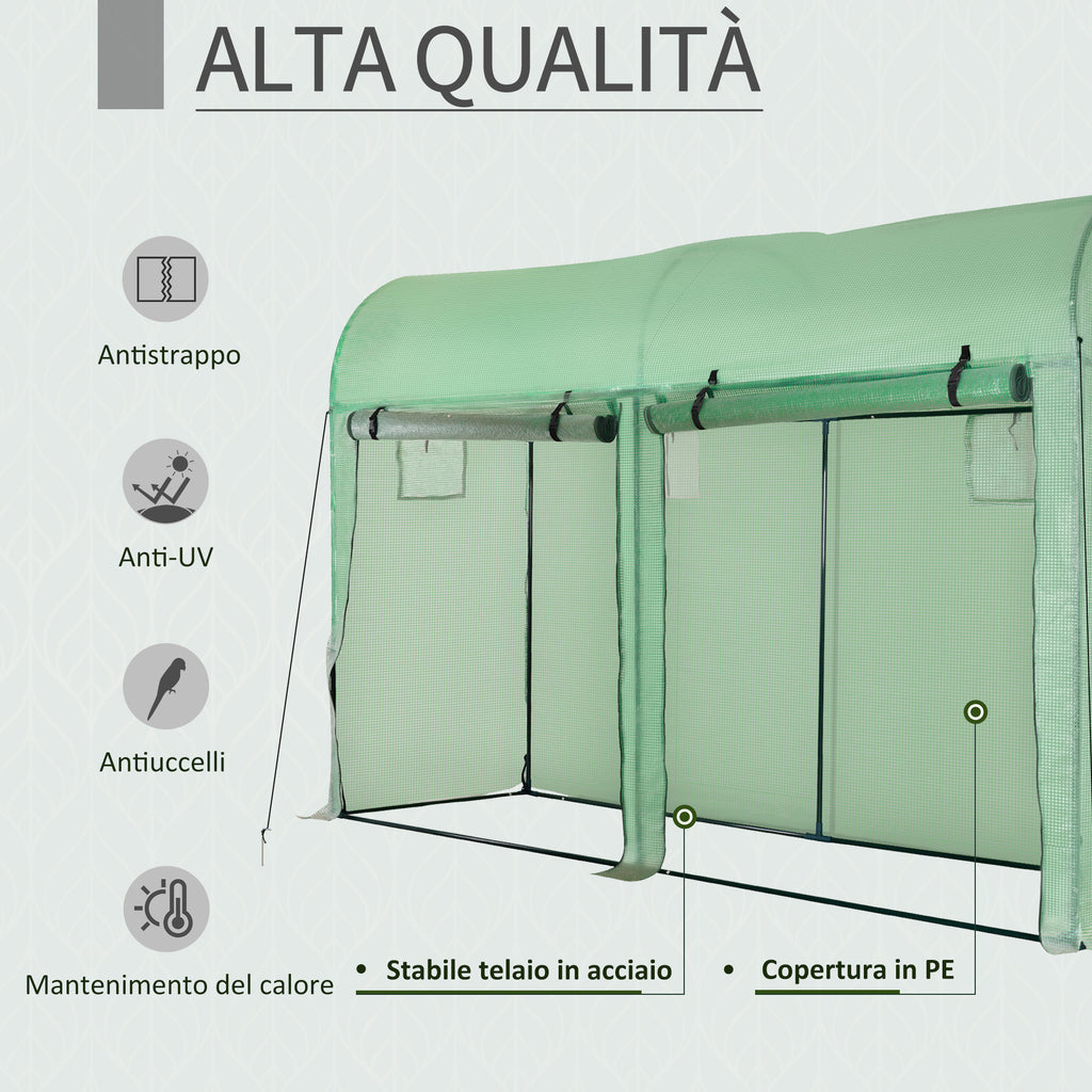 Das Gewächshaus für Gemüse und Gärten ist die ideale Wahl für Grünliebhaber. Die Kunststoffabdeckung schützt die Pflanzen vor übermäßiger Sonneneinstrahlung und der Stahlrahmen ist stabil und stark, um rauen Wetterbedingungen standzuhalten. Die doppelte Rolltür und die Fenster sorgen für eine optimale Belüftung und gute Beleuchtung. Lassen Sie sich dieses Tunnelgewächshaus zum Schutz Ihrer Pflanzen nicht entgehen!