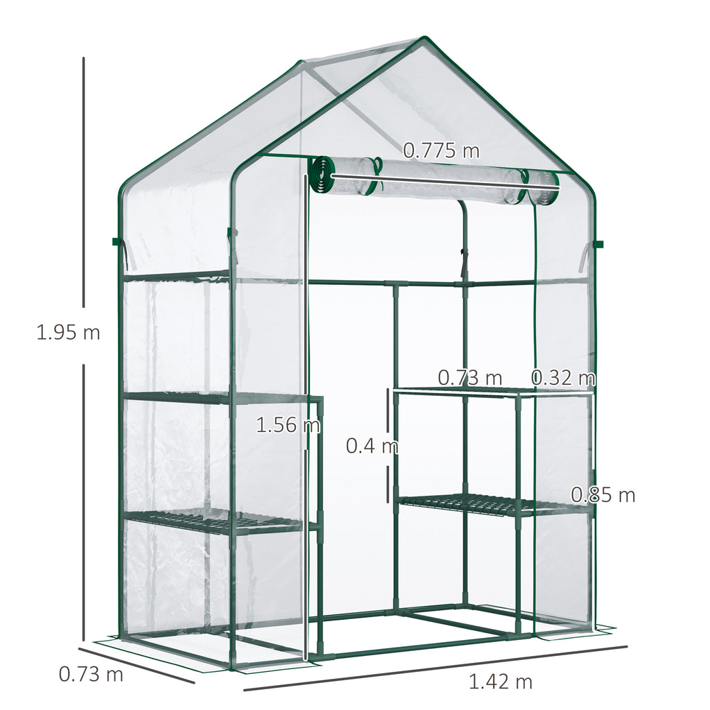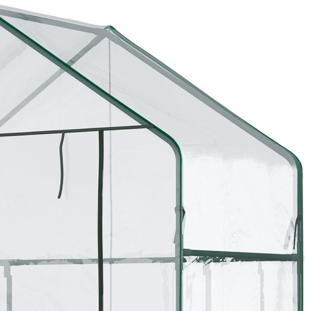 Unser Gewächshaus montiert leichte und dennoch robuste PE-Abdeckungen auf einem pulverbeschichteten Stahlrahmen. Die Reißverschlusstür ermöglicht einen einfachen Zugang und Belüftung und kann versiegelt werden, um das gewünschte Klima im Inneren aufrechtzuerhalten. Dies macht das Gewächshaus perfekt, um Ihre Setzlinge vor übermäßiger Hitze oder Kälte zu schützen und sie während der ganzen Jahreszeit sicher zu halten. Mit diesem Gewächshaus können Sie sofort mit der Gartenarbeit beginnen.