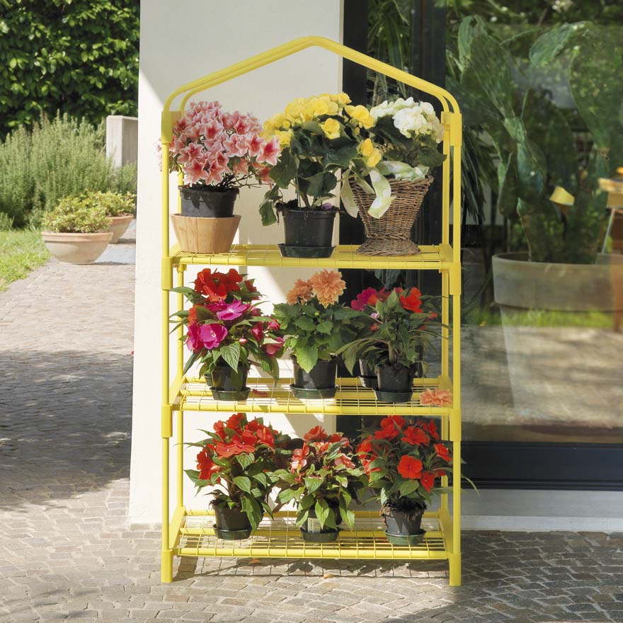 Das gelbe Azaleen-Gewächshaus mit 3 Regalen hat eine tragende Struktur und Regale aus lackiertem Stahl. Die UV-beständige Plane und keine Plane können als Pflanzgefäß im Freien verwendet werden.