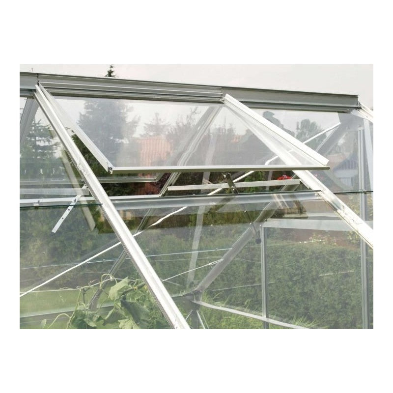 Giove, il pianeta più grande del nostro sistema solare, è l'omonimo di questa serra generosamente progettata per giardinieri piu' avanzati. Lo stesso giardiniere, ma soprattutto le sue piante ad alto fusto, troveranno sufficiente spazio per svilupparsi grazie ai lati alti 1,54 m e al colmo della serra Giove alta 2,48 m. Jupiter è disponibile in quattro diverse dimensioni con superficie da 6,7 a 11,5 m² e in tre colori: alluminio anodizzato, smeraldo o nero verniciato a polvere. Tutti i modelli sono ottimizzati per la ventilazione: il finestrino laterale in dotazione, in combinazione con i lucernari da tetto e le doppie porte scorrevoli, consentono una circolazione ottimale dell'aria nella serra. Jupiter è disponibile completamente installato con vetro di sicurezza cristallo di circa 3 mm di spessore o con lastre a due pareti. La soluzione in vetro lascia entrare molta luce nella serra e dona un l'aspetto 'classico' del vetro. Grazie alla visuale libera della serra, si fonde silenziosamente con l'ambiente circostante. Tuttavia, nelle giornate soleggiate e calde, il vetro dovrebbe essere ombreggiato per proteggere le piante dall'eccesiva luce. Il vetro di sicurezza non si rompe con gli spigoli vivi e offre quindi una maggiore sicurezza rispetto al vetro grezzo. La lastre alveolari, disponibili negli spessori 4 e 6 mm (i lucernari sempre con 4 mm), hanno migliori proprietà isolanti. Sono realizzati in policarbonato infrangibile stabilizzato ai raggi UV. La superficie leggermente lattiginosa diffonde la luce in modo che l'ombreggiatura di solito non sia necessaria. Le lastre in vetro e le lastre in policarbonato sono ancorate al telaio mediante la collaudata tecnologia con clip a molla in vetro. La lastra in policarbonato viene installata tra i profili in un unico pezzo, mentre le lastre di vetro sono montate sovrapposte. Il modello è dotato di una doppia anta scorrevole con cuscinetti a sfera, con una larghezza di 122 cm e un'altezza di 191 cm. Ogni modello viene fornito di serie con un finestrino laterale e due o quattro lucernari sul tetto e grondaie.