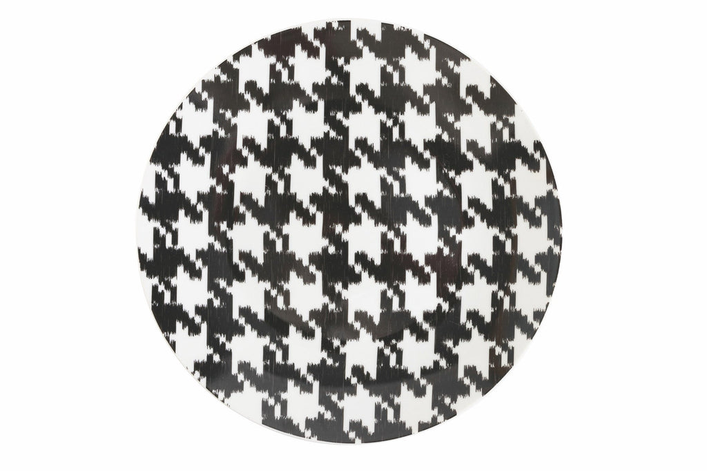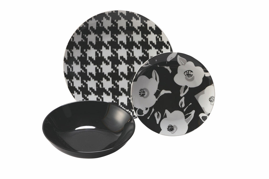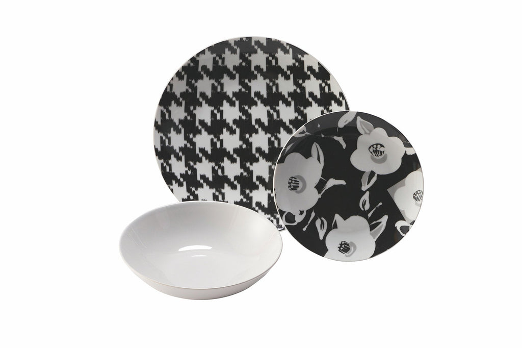 Der Service Coco Walk ist ein Spaziergang durch die Pariser Modestraßen. So elegant wie die ewige Hochzeit zwischen Schwarz und Weiß, kommt unser Set mit einem naiven Blumendekor und einem Mix aus geometrischen Verzierungen ins Spiel. Darunter sticht das zeitlose Pied de Poule hervor, das uns mit seiner Textur sofort in die 1940er-Jahre zurückversetzt.