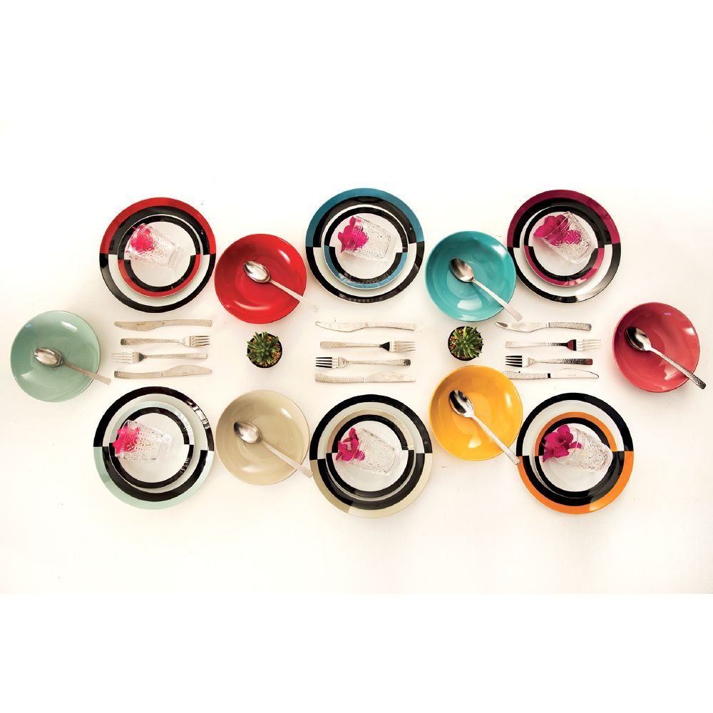 - Jeder Service besteht aus 6 Tischplätzen, jeder mit einer anderen Dekoration oder Farbe als die anderen Gerichte auf demselben Set.