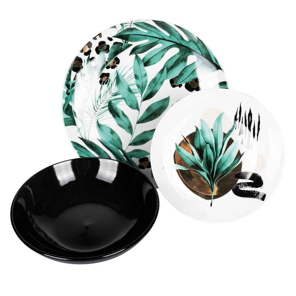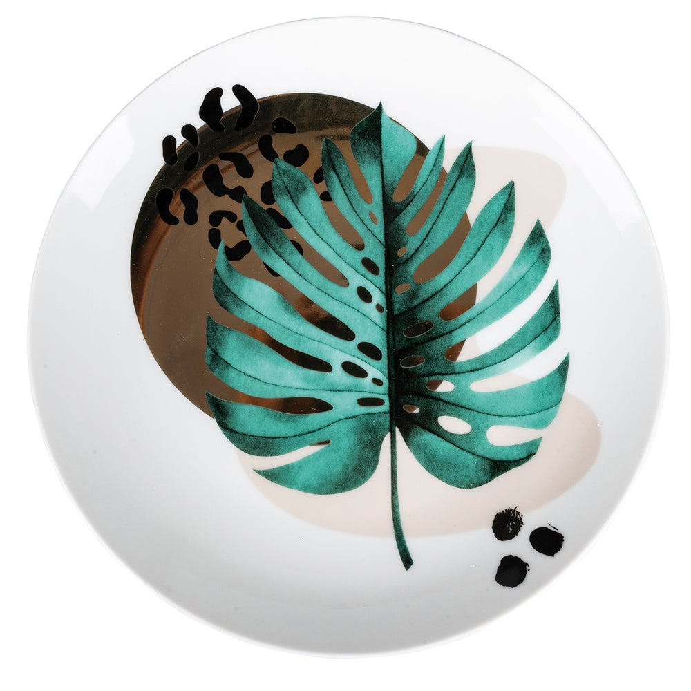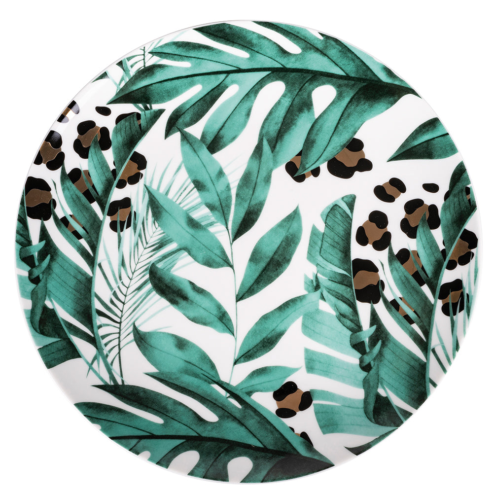 Der Dschungel-Stil ist die perfekte Alternative, um auf Ihrem Mise en Place eine kleine Grünfläche zu schaffen, eine bezaubernde Oase, die durch einen Hauch von wildem Animalier bereichert wird. Die Samana-Linie ist davon inspiriert: eine Explosion eleganter exotischer grüner Blätter, die sich auf einheitlichen Hintergründen kreuzen, aber mit Details angereichert sind, die in ihrer Einfachheit einen Hauch von Farbe und Raffinesse verleihen.