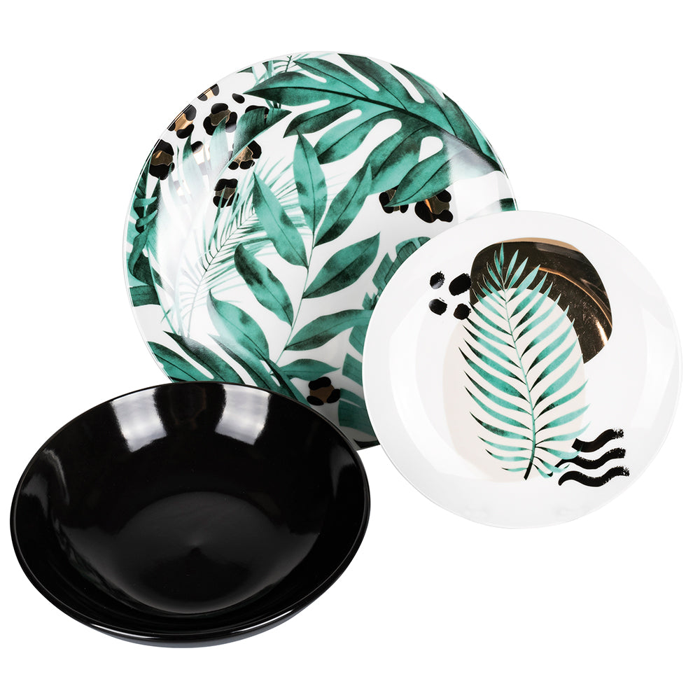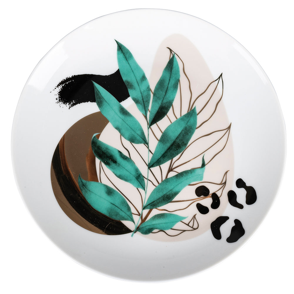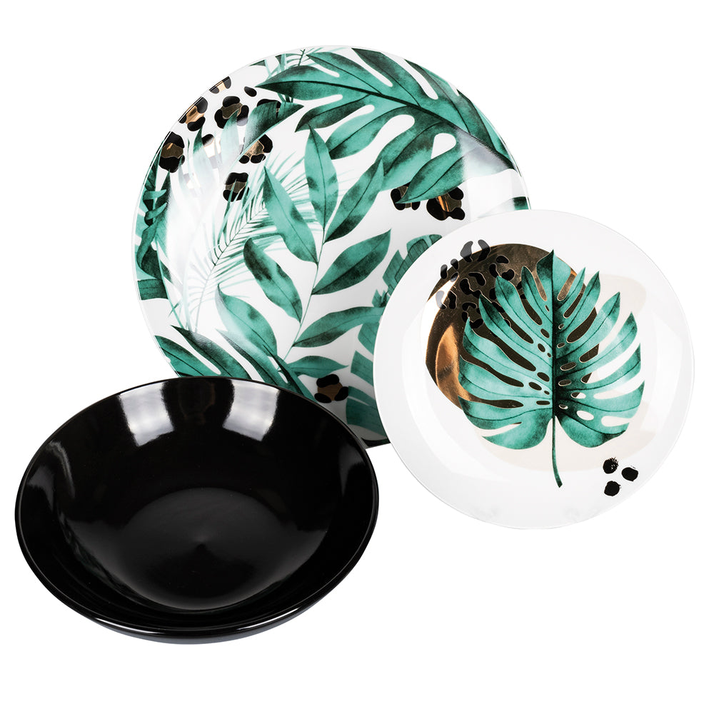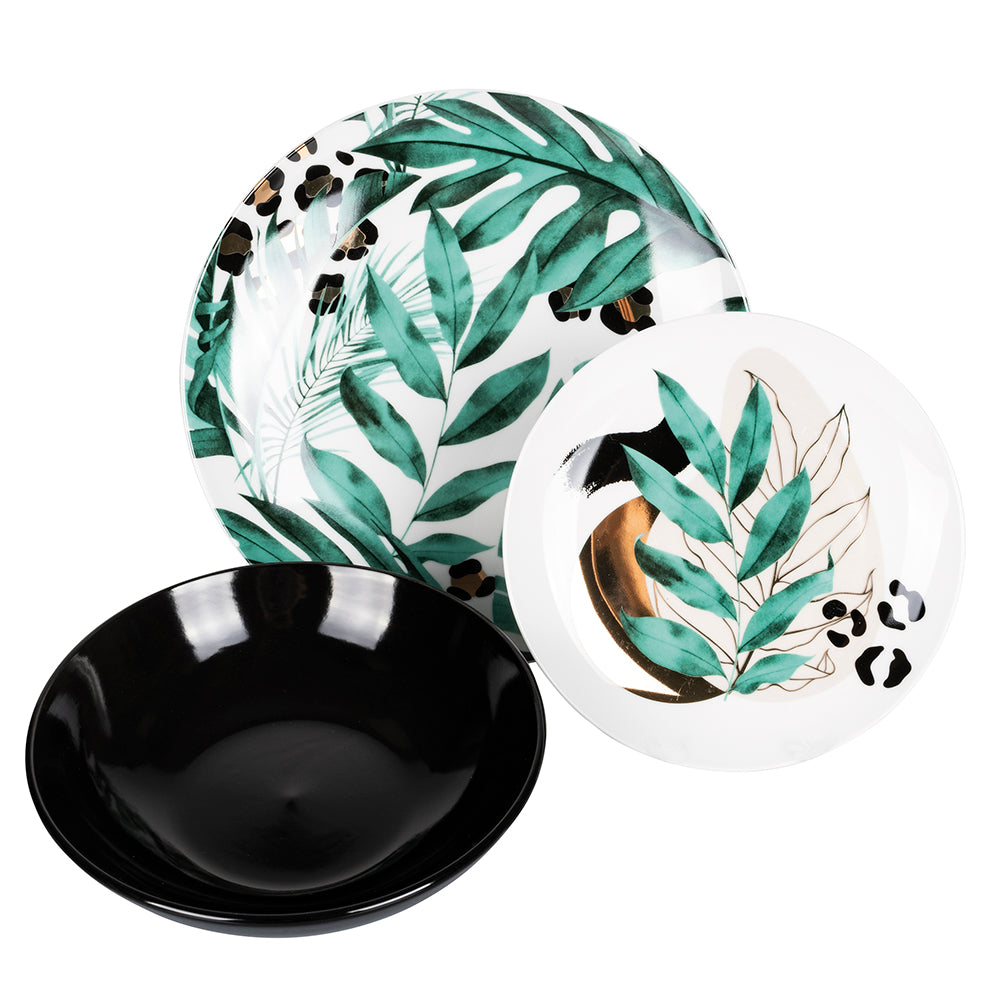 Der Dschungel-Stil ist die perfekte Alternative, um auf Ihrem Mise en Place eine kleine Grünfläche zu schaffen, eine bezaubernde Oase, die durch einen Hauch von wildem Animalier bereichert wird. Die Samana-Linie ist davon inspiriert: eine Explosion eleganter exotischer grüner Blätter, die sich auf einheitlichen Hintergründen kreuzen, aber mit Details angereichert sind, die in ihrer Einfachheit einen Hauch von Farbe und Raffinesse verleihen.