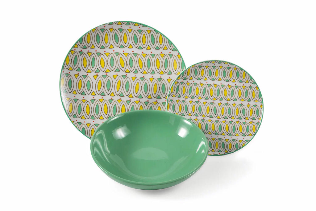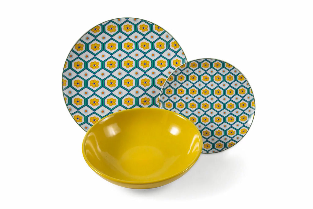 Eleganz und Leichtigkeit zeichnen die flachen Teller und Obstteller aus sehr feinem weißem Porzellan aus, auf denen das Dekor angebracht ist. Das glasierte Steinzeug der sechs Suppenteller hingegen bringt Funktionalität auf den Tisch: Dick und widerstandsfähig hält es die Hitze heißer erster Gänge wie Suppen und Suppen und erleichtert deren Anrichten. Die glasierte Oberfläche verstärkt die Farben des Tisches. Aufteilung am Tisch Jedes Service besteht aus 6 Tischplätzen, jeder mit einer anderen Dekoration oder Farbe als die anderen Gerichte auf demselben Set. Wer sich für den Scomposti entscheidet, erhält einen unkonventionellen und anderen Tisch, mehrfarbig, mit wechselnden Mustern und Farben. Jedem Gast, der um einen Tisch sitzt, ordnen wir eine andere Farbe zu, denn jeder trägt auf unterschiedliche Weise zur Geselligkeit bei.