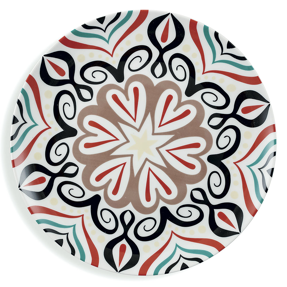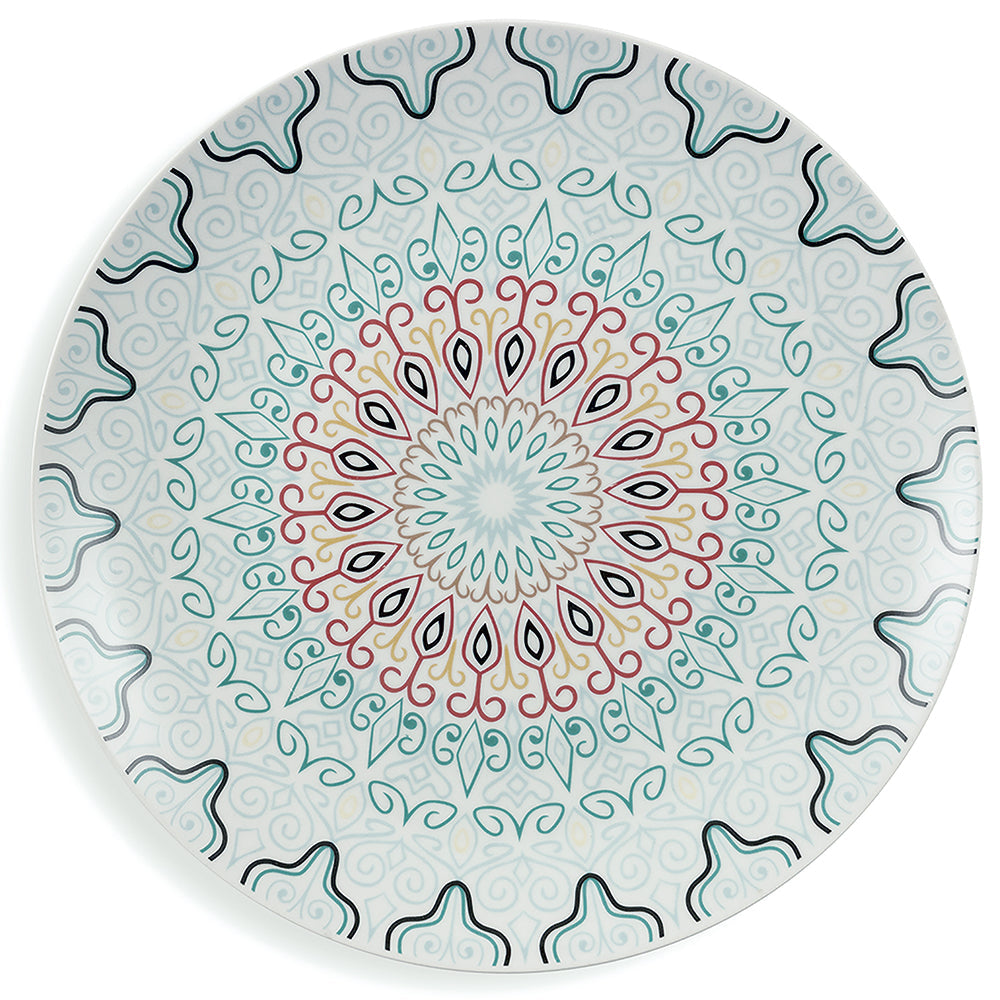 Porzellan und Steinzeug: die perfekte Mischung aus Funktionalität und Raffinesse. Eleganz und Leichtigkeit zeichnen die flachen Teller und Obstteller aus sehr feinem weißem Porzellan aus, auf denen das Dekor angebracht ist. Das glasierte Steinzeug der sechs Suppenteller hingegen bringt Funktionalität auf den Tisch: Dick und widerstandsfähig hält es die Hitze heißer erster Gänge wie Suppen und Suppen und erleichtert deren Anrichten. Die glasierte Oberfläche verstärkt die Farben des Tisches.