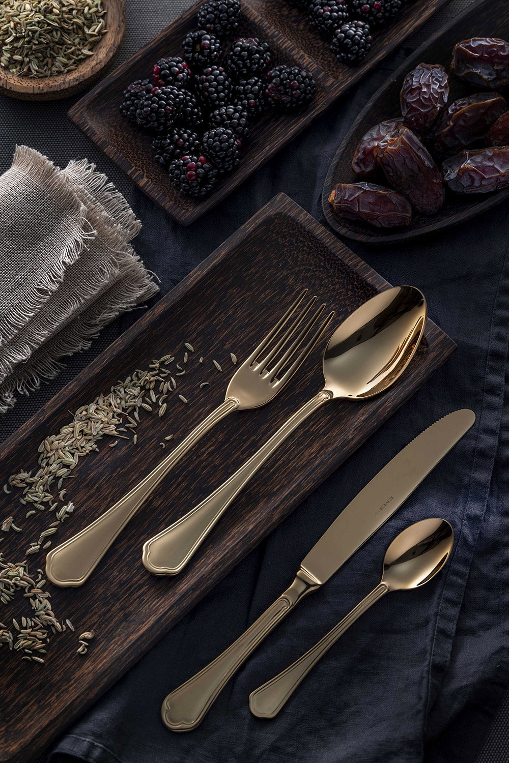 Domus Gold ist eine Besteckkollektion aus hochglanzpoliertem Edelstahl 18/10 mit goldenem PVD-Finish.