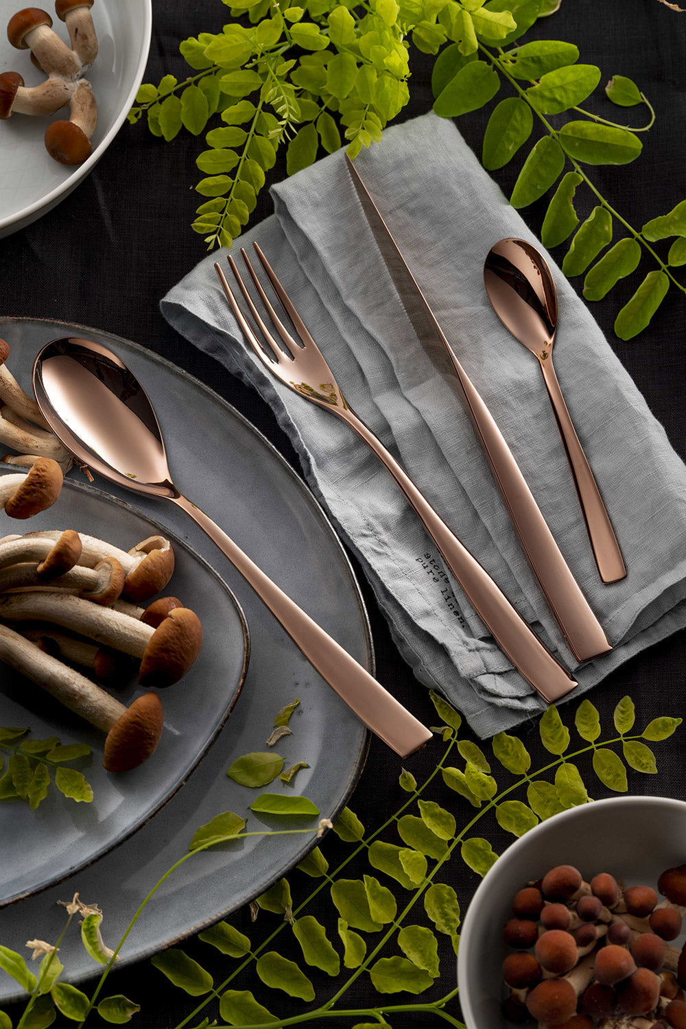 PVD steht für Physical Vapour Deposition. Es ist eine Technologie, die zum Färben von Stahl durch Abscheidung sehr dünner Metallfilme verwendet wird. Der Prozess findet in Vakuumkammern statt und besteht aus der Verdampfung und anschließenden Kondensation der Metalle auf dem Besteck. Diese Behandlung mit einer Reihe wunderbarer Farbnuancen verschönert das Besteck, macht es widerstandsfähiger gegen Abnutzung und Kratzer und ist eine absolut nachhaltige Beschichtung, die für den Einsatz im Lebensmittelbereich geeignet ist.