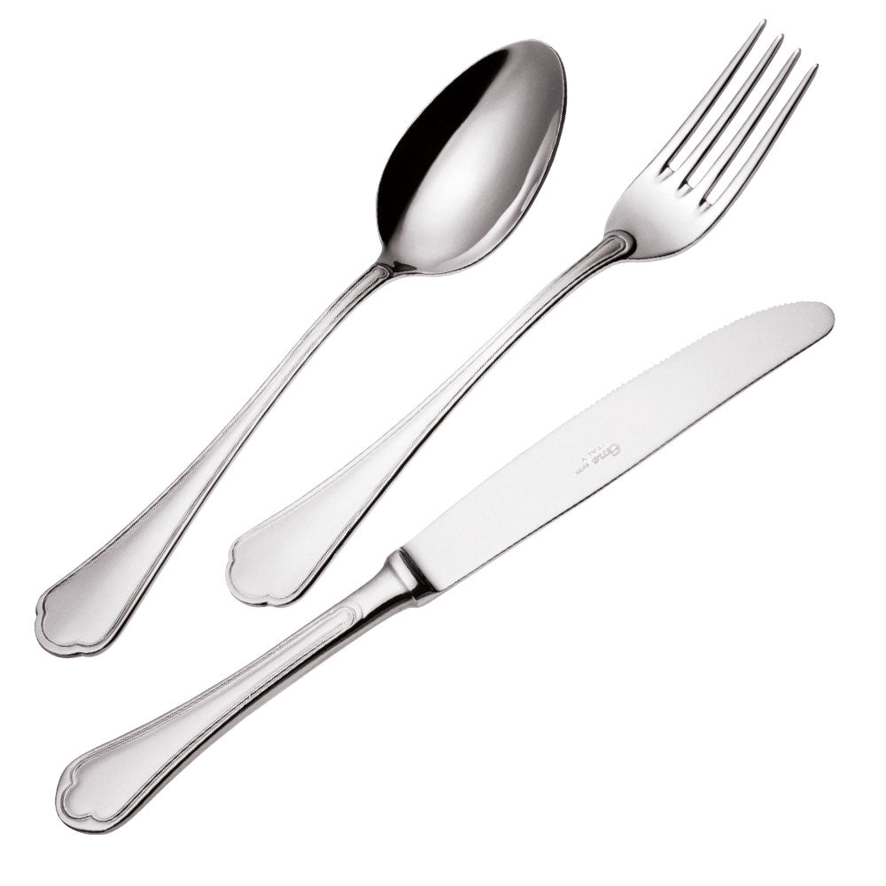 24-teiliges Set für 6 Personen . Domus ist eine Bestecklinie mit klassischem Geschmack, harmonischen Details und abgerundeten Formen, die an Blumen erinnern. Ideales Besteck, um einen eleganten und stilvollen Tisch zu decken. Besteck aus hochglanzpoliertem 18/10 Stahl .