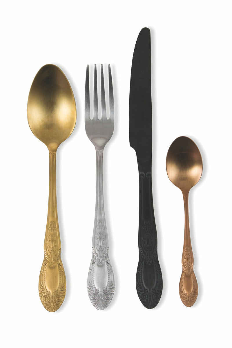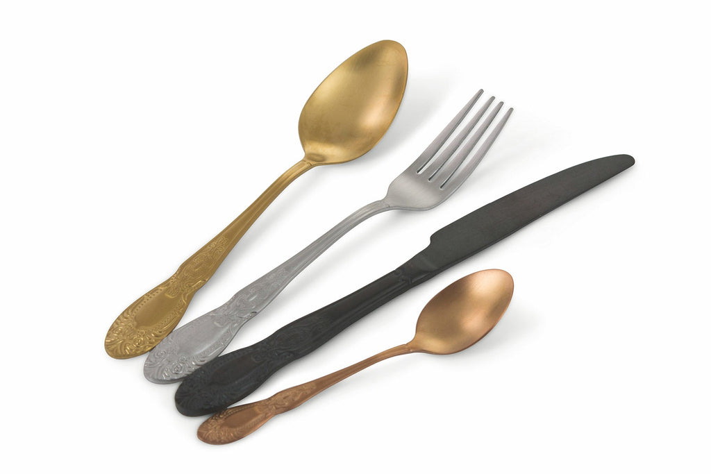 - Das Set besteht aus 6 Teelöffeln, 6 Löffeln, 6 Gabeln, 6 Messern. in 4 Farben: Silber, Schwarz, Kupfer und Gold
