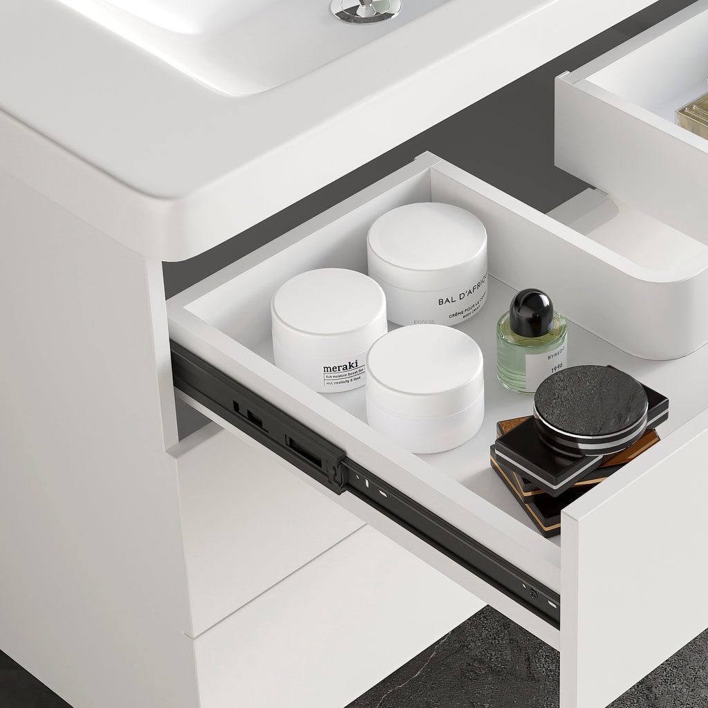 Guide con estrazione totale per cassetti con chiusura soft che fornisce una chiusura ammortizzata del cassetto, e uno scivolamento morbido e silenzioso grazie ai suoi cuscinetti a sfera di alta qualità. Sono noti, inoltre, per la grande capacità di carico che può arrivare a sopportare fino a 35 kg per cassetto. Il montaggio al cassetto si realizza mediante viti e lo smontaggio con grilletto.