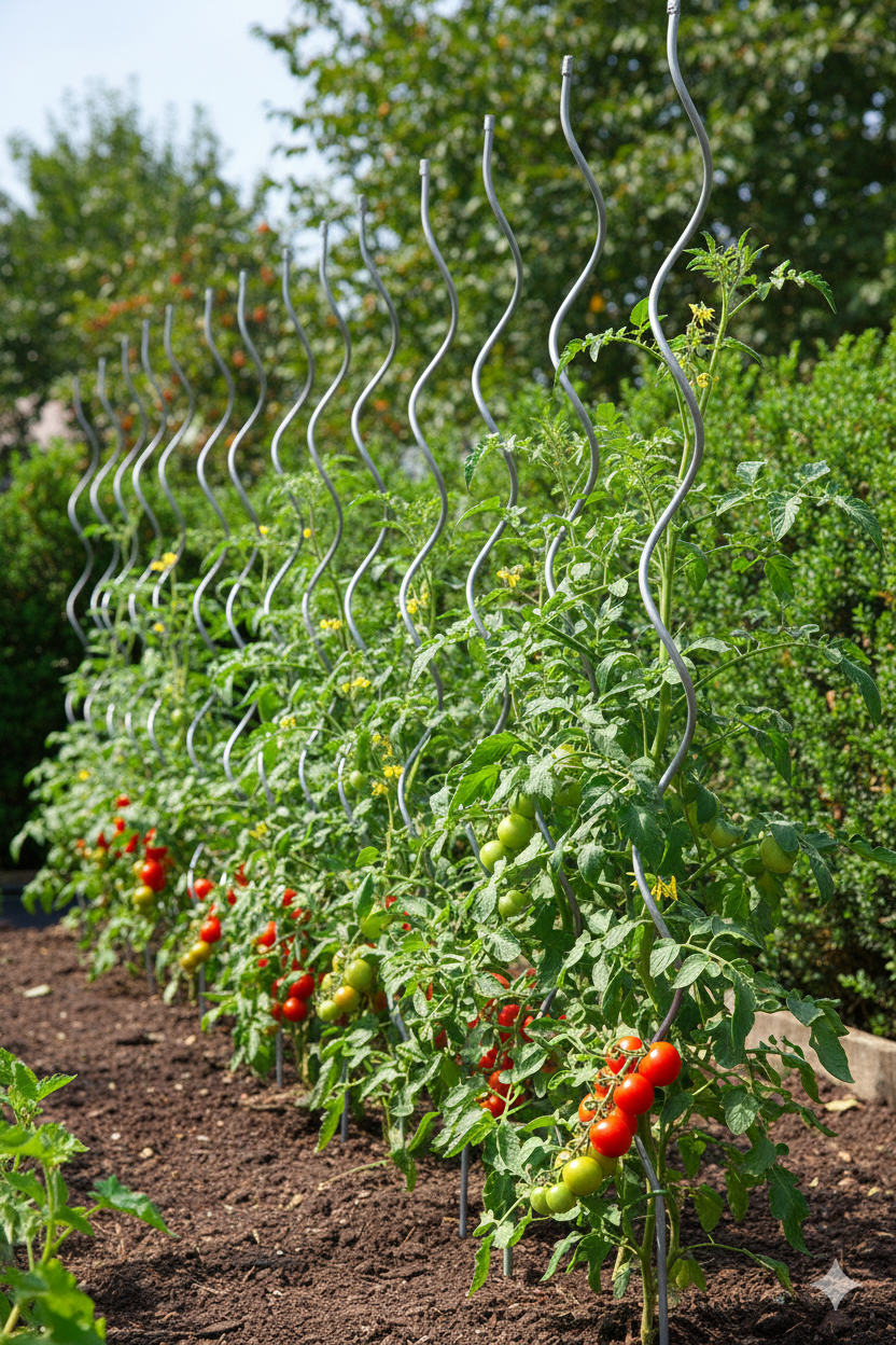 Spezielle Spiralstützen für Tomaten und Kletterpflanzen aus feuerverzinktem Stahldraht. Die Spiralform ermöglicht es Pflanzen, ohne Schnüre zu wachsen.