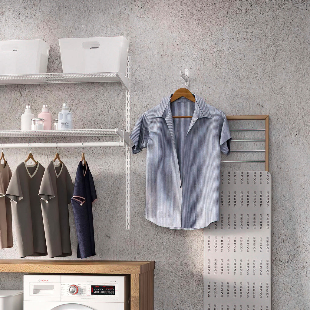 Jagmet Kleiderhaken lassen sich zusammenklappen, um Platz in Schränken, Umkleidekabinen oder Waschküchen zu sparen. Die Haken sind über den Löchern positioniert, sodass der Haken abgesenkt werden kann, ohne herunterzufallen.Sie sind für die Befestigung an der Wand konzipiert und bestehen aus weiß lackiertem Stahl und Kunststoff. Dieses Set besteht aus zwei Haken zusammen mit den für deren Montage erforderlichen Schrauben und Dübeln.