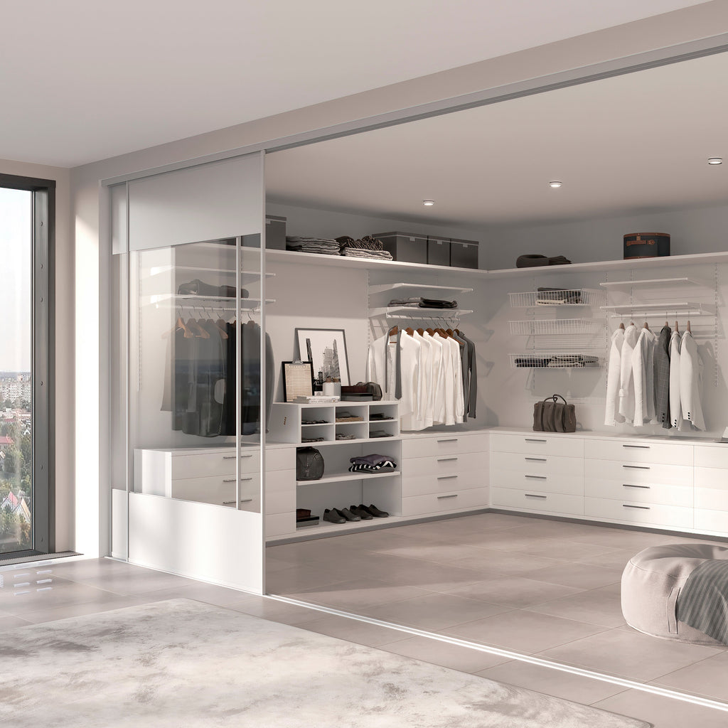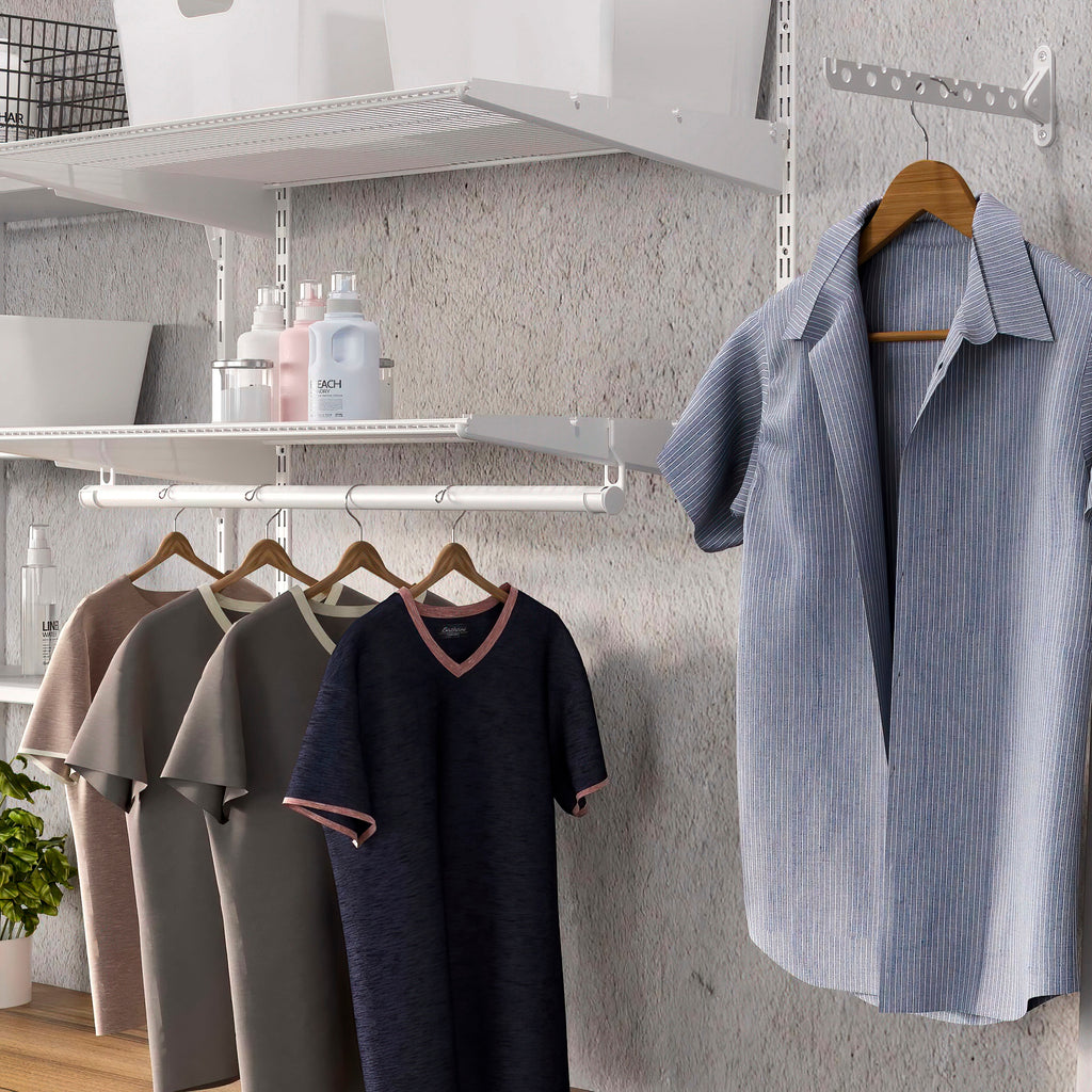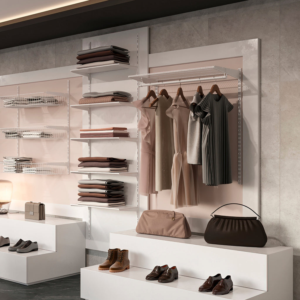 Zubehörset zur Herstellung von Kleiderstangen zur Innenausstattung von Kleiderschränken, Ankleidezimmern, Waschküchen oder Vorratskammern Sie sind für die Verwendung mit Metalldrahtregalen und entsprechenden Regalträgern (Code 7027612) bestimmt. Diese Halter haben Schlitze, um die Kleiderstange zu platzieren. Dieses Kit besteht aus zwei Stangen, zwei Sätzen Halterungen (rechts und links) und zwei Sätzen Endkappen.
