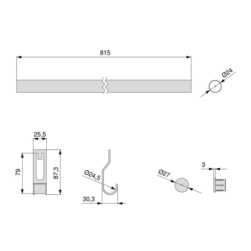 - Die Stange hat die Abmessungen Ø27x815 mm und trägt eine maximale Belastung von 10 kg.