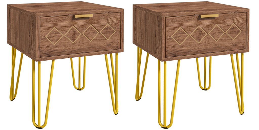 - LOOK MODERNO: Semplicità non significa rinunciare allo stile. La finitura con venature del legno naturale, le linee incise e le gambe d'acciaio a forcina in tonalità oro di questi comodini con cassetti creano un aspetto minimalista e moderno