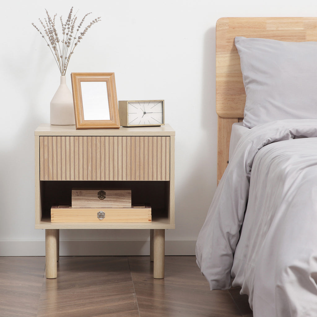 Benötigen Sie mehr Platz im Schlafzimmer oder in anderen Bereichen des Hauses? Dieser Nachttisch ist genau das Richtige für Sie. Der natürliche Holzton schafft einen modernen Stil, etwas anderes für zu Hause oder sogar das Büro. Die offene Schublade und das Regal der modernen Nachttische bieten ausreichend Platz für all Ihre Schlafutensilien. Sie können sie als Nachttische neben dem Bett oder als Beistelltische im Wohnzimmer verwenden. Bewegen Sie die Nachttische dorthin, wo Sie viele Gegenstände sammeln möchten.