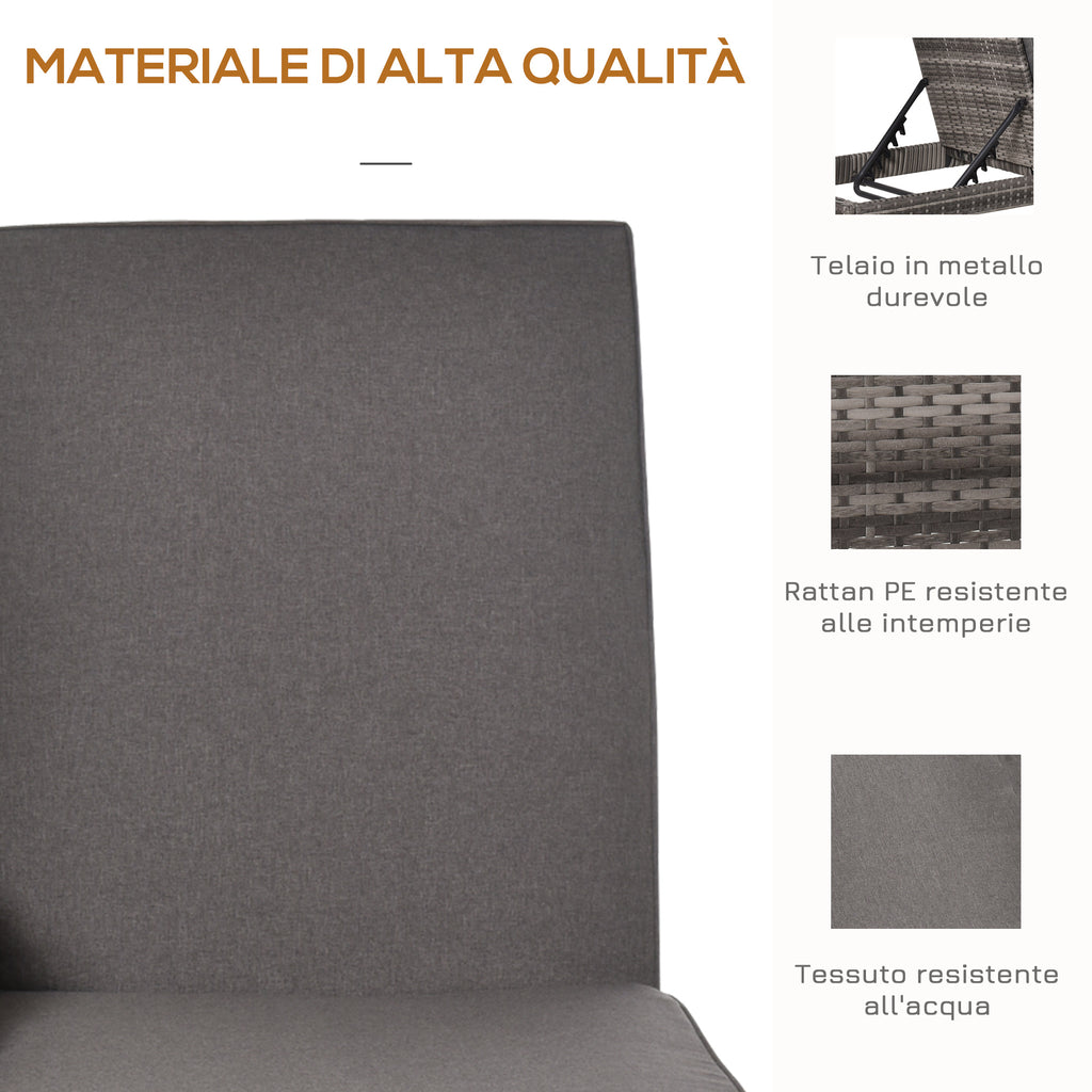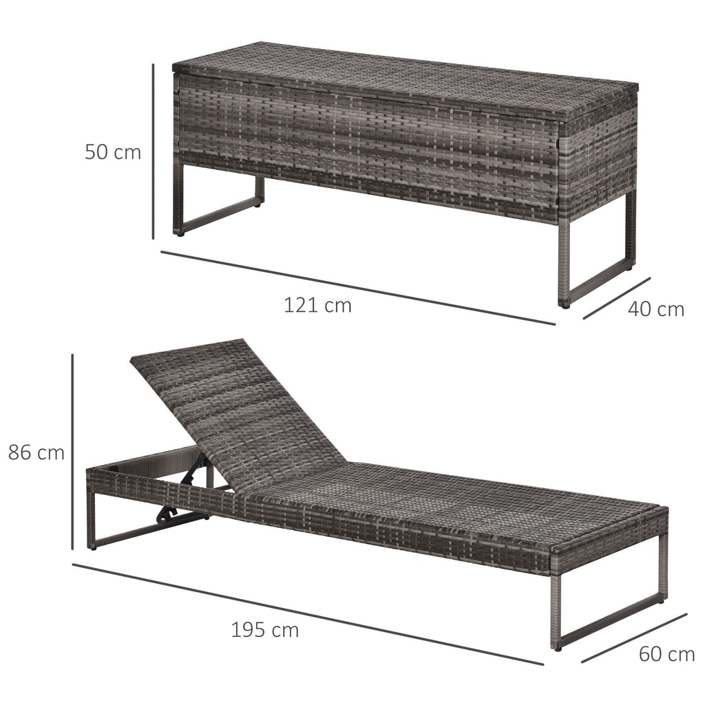 Möchten Sie Ihren Garten dekorieren? Dieses 3-teilige Set ist die richtige Lösung! Bestehend aus 2 Sonnenliegen und 1 Tisch aus grauem synthetischem Rattan, die Sie je nach Platzbedarf in verschiedenen Kombinationen organisieren können. Die Liegen sind wasserdicht, lichtecht und ihre Rückenlehne lässt sich in 5 Höhenstufen verstellen.