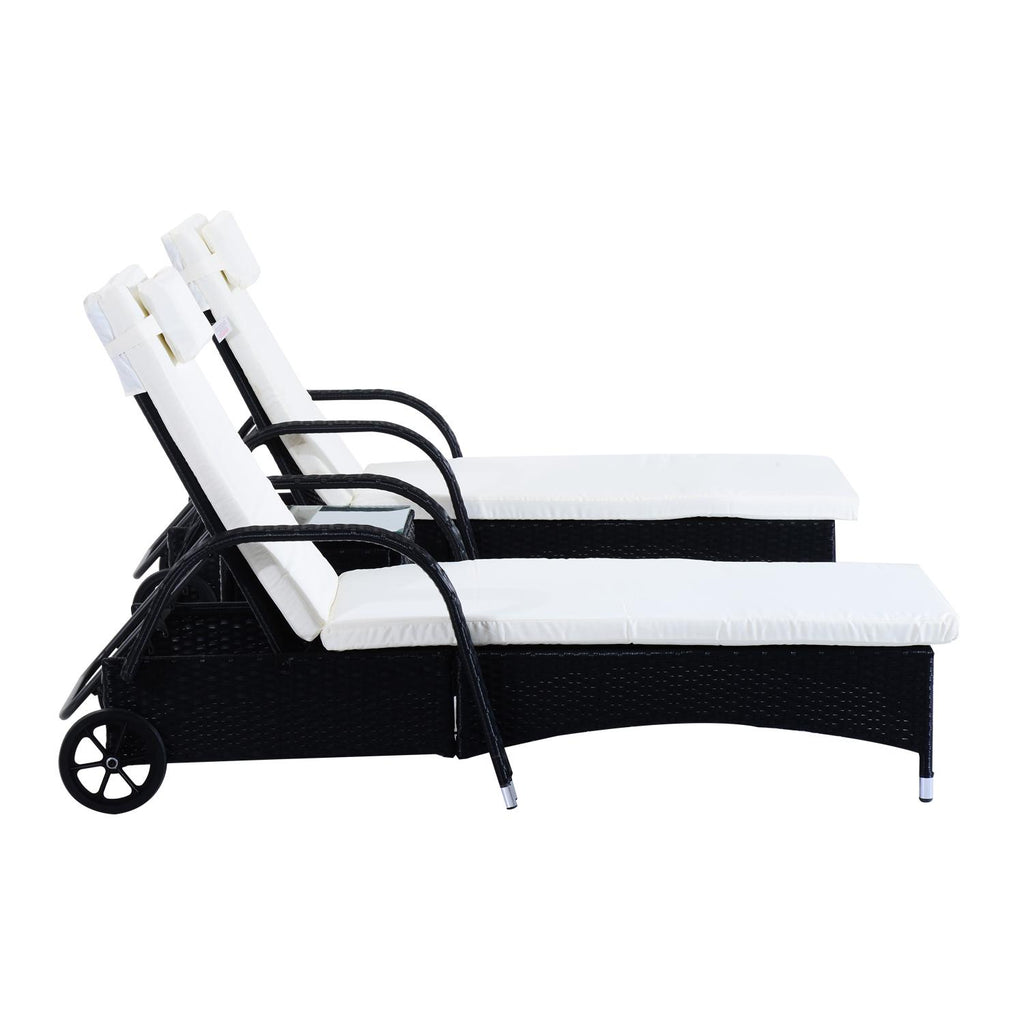 Set aus 2 Garten-Sonnenliegen aus Rattan mit gepolsterter Matratze und schwarzem Couchtisch