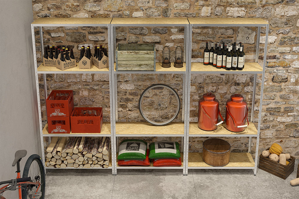 Metallregal mit 4 Spanplattenböden, jeder Boden trägt 175 kg.