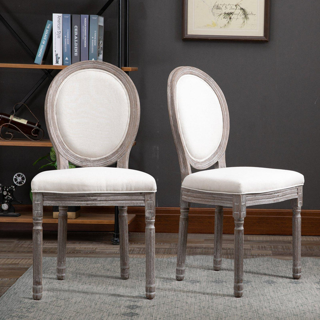 Set aus 2 Holzstühlen mit weißem Leinen bezogen