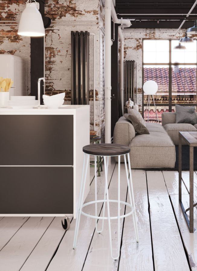 Runder Barhocker mit weißem Metall. Ulmenholz und Eisen verschmelzen zu originellen dekorativen Kontrasten. Die Hocker und Tische der Detroit-Linie eignen sich perfekt, um der Küche oder dem Wohnzimmer einen glamourösen industriellen Touch zu verleihen, ohne zu viel Platz einzunehmen. Wesentliche und solide Linien, die Ihre Gäste willkommen heißen und sie in die unterirdische Atmosphäre eines Soho-Pubs transportieren.