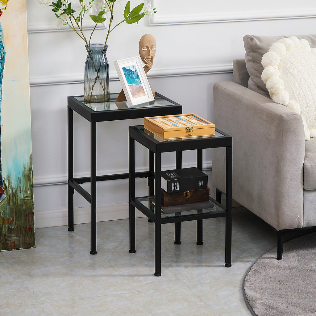 Set 2 Tavolini con Ripiano in Vetro e Struttura in Acciaio Nero