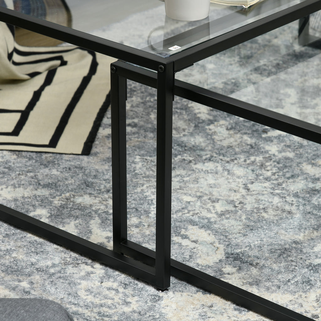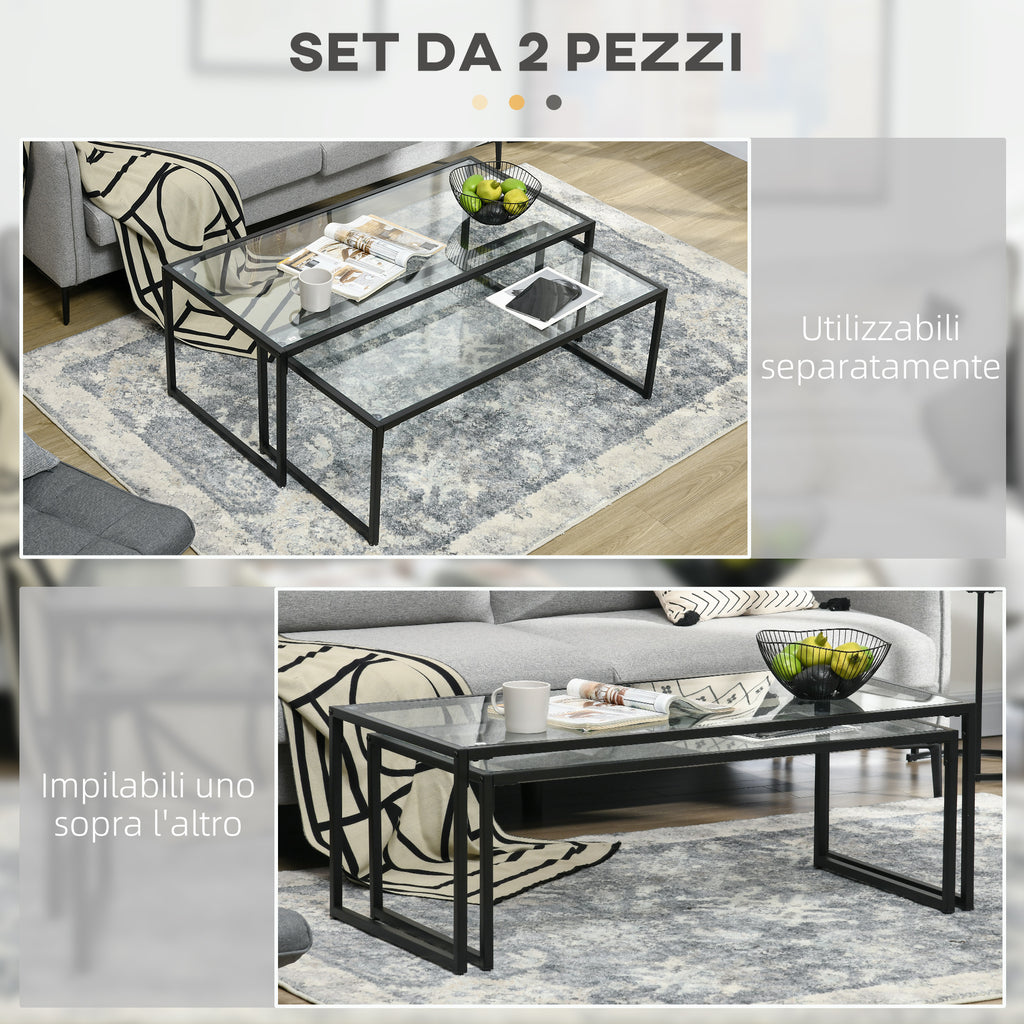 Set 2 Tavolini da Caffè Impilabili in Vetro temperato e Acciaio Nero