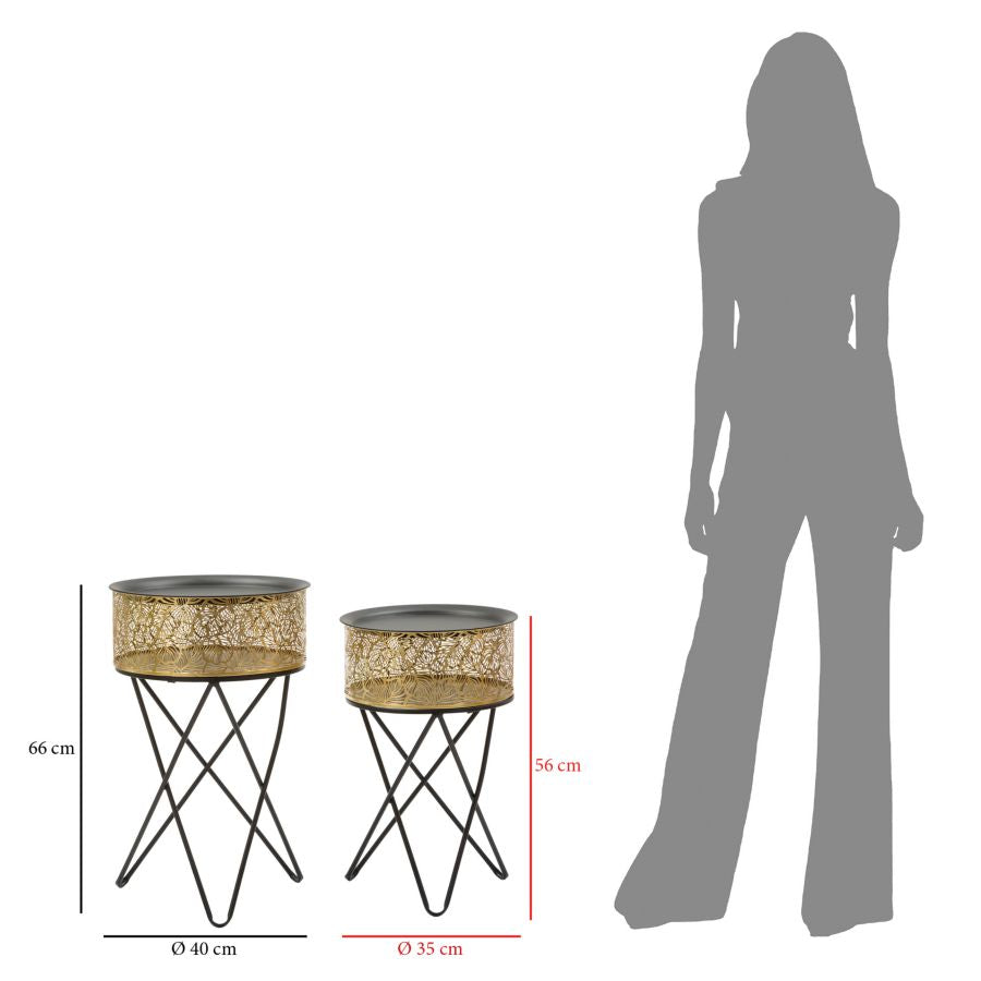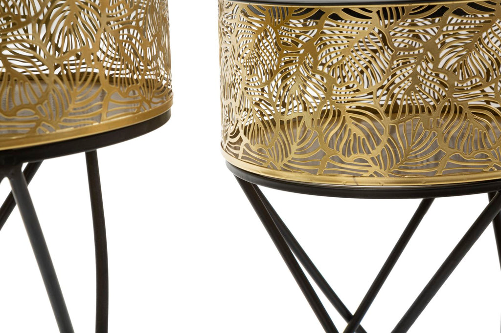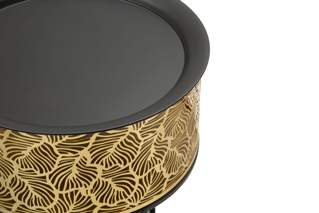 Paar runde Tische mit Platte und Beinen aus schwarzem Metall und Platte aus goldenem Metall mit geschnitzten Verzierungen, die an die Blätter erinnern. Der Deckel ist abnehmbar, im Inneren befindet sich ein praktischer Behälter.