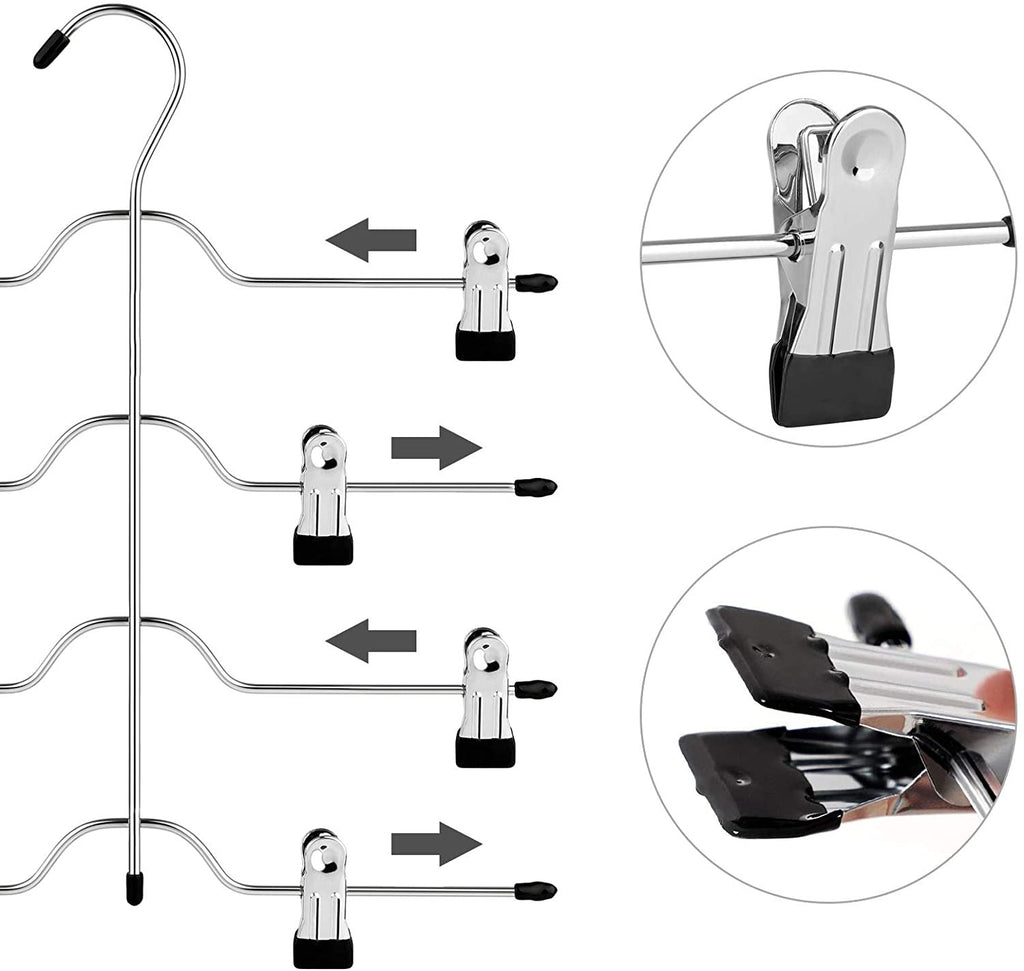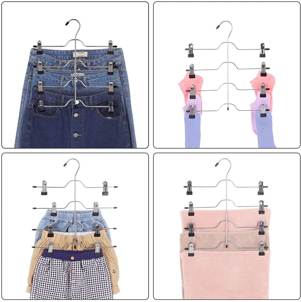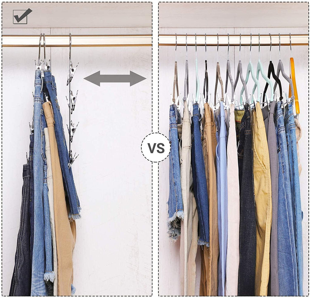 Wenn Sie wenig Platz in Ihrem Kleiderschrank haben, aber nicht auf Ihre gesamte Kleidung verzichten möchten, sind diese Kleiderbügel genau das Richtige für Sie: Ein einziger Kleiderbügel kann bis zu 4 Hosen aufnehmen und nimmt dabei nur wenig Platz ein, wodurch Ihr Kleiderschrank viel aufgeräumter und organisierter wird. Aus Metall gefertigt, ist er mit rutschfesten Clips ausgestattet, die an verschiedene Dicken angepasst werden können, tatsächlich kann er dank der rutschfesten Gummipolster, die einen festen Halt ermöglichen, problemlos Mäntel, Pullover, Decken und Handtücher tragen.