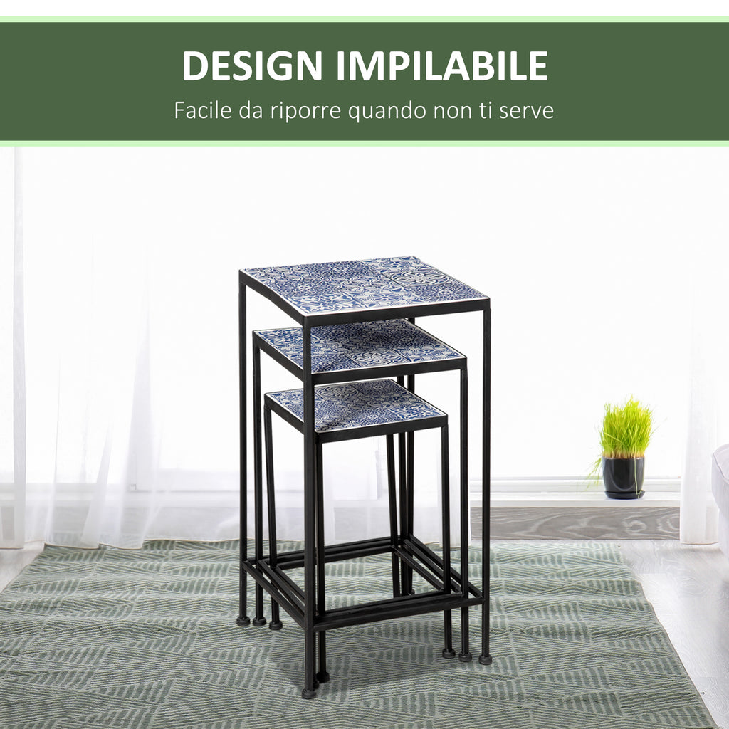 Set mit 3 Blumentöpfen mit Keramikfliesenoberfläche für Garten und Balkon aus blauem und schwarzem Metall