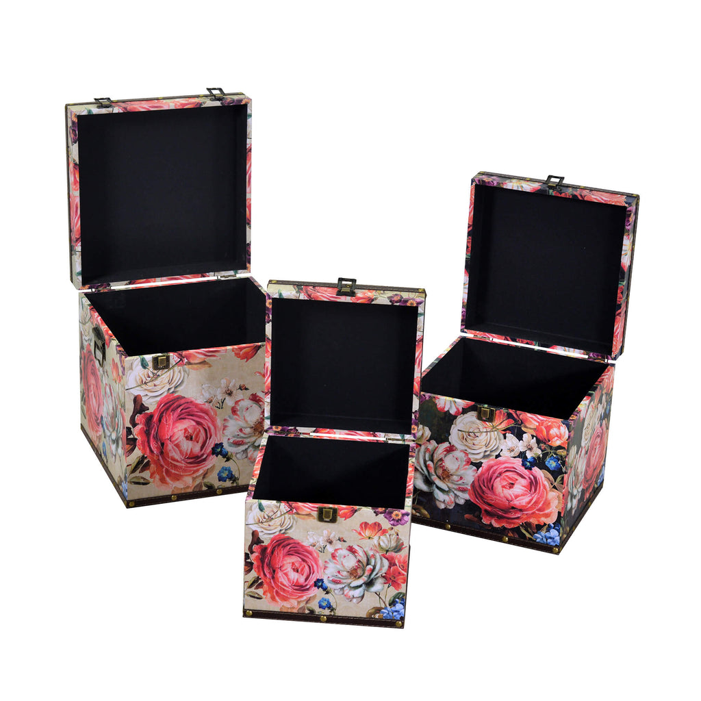 Set mit 3 Schachteln aus Kunstleder mit cremefarbenen Blumen